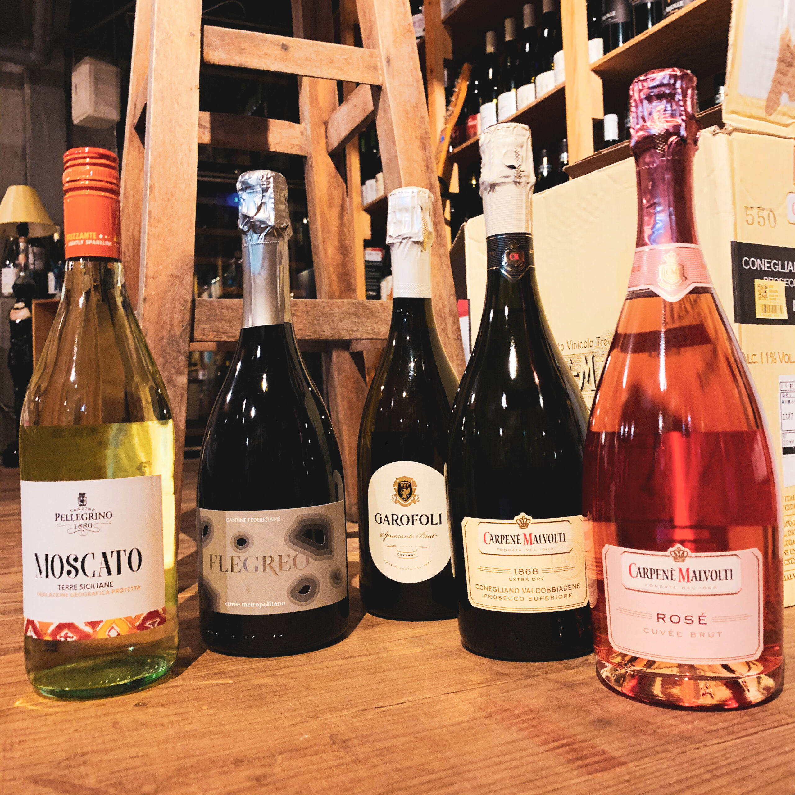 左端、シチリア州から モスカート・フリッツァンテ マスカットとほのかにアンズの香りで心地よい甘口、微発砲。よく冷やしてぐいぐいのど越し爽快です。