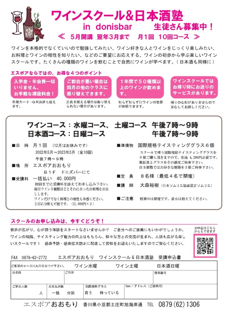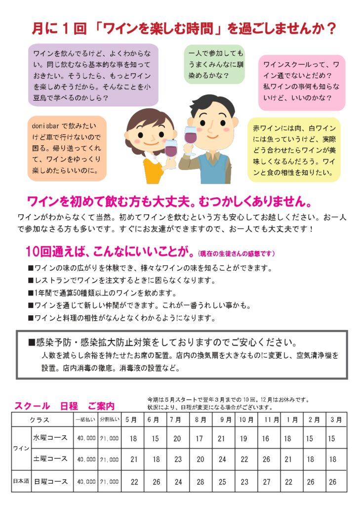 ●2022年5月〜2023年3月の10回コース (12月お休み) ●ワインスクール:水曜クラスと土曜クラス ●日本酒スクール:日曜クラス 同月内で他のクラスへの振り替えも可能ですので、どうしても日程が合わない場合も安心です。 皆様のご参加を心よりお待ちいたしております。ご不明な点がございましたら、お気軽にお問い合わせください。