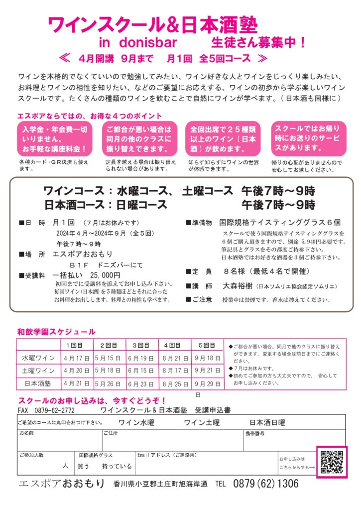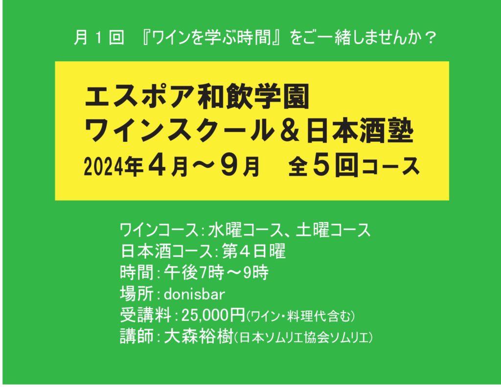 4月から9月までの5回コースで、ワインスクール、日本酒塾の生徒さんを募集いたします。毎回5種類以上お飲みいただけ、またそれに合わせてペアリングも自然に学べます。むつかしいことは全くありませんので、お気軽にお申し込みください。お帰りのお送りも用意しておりますので安心してお越しください。