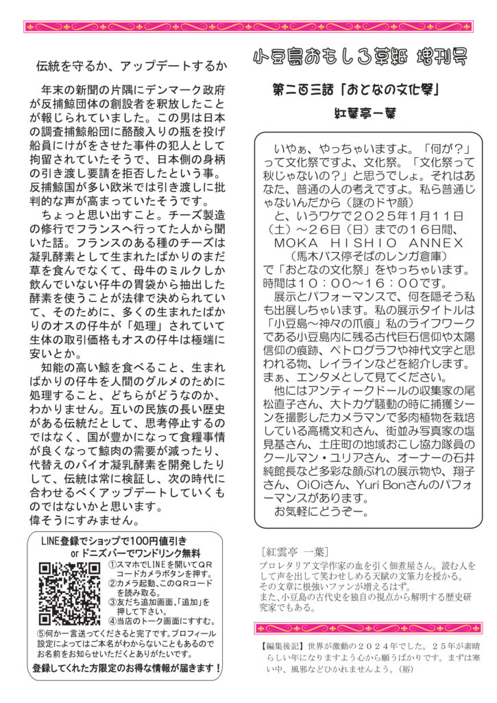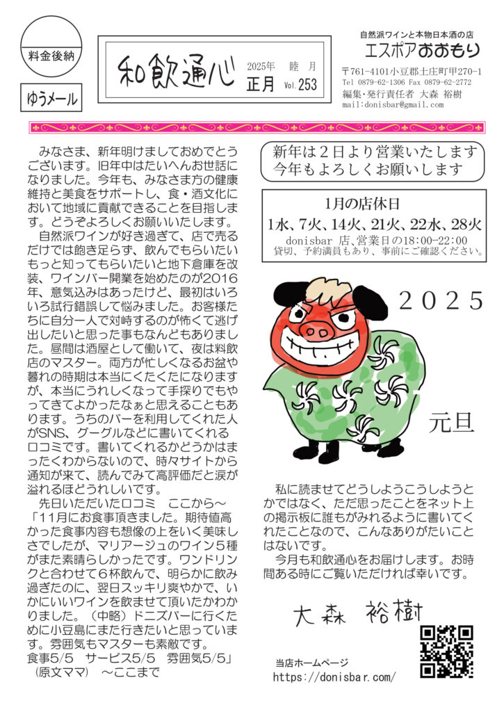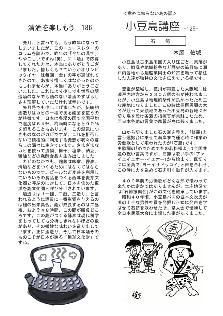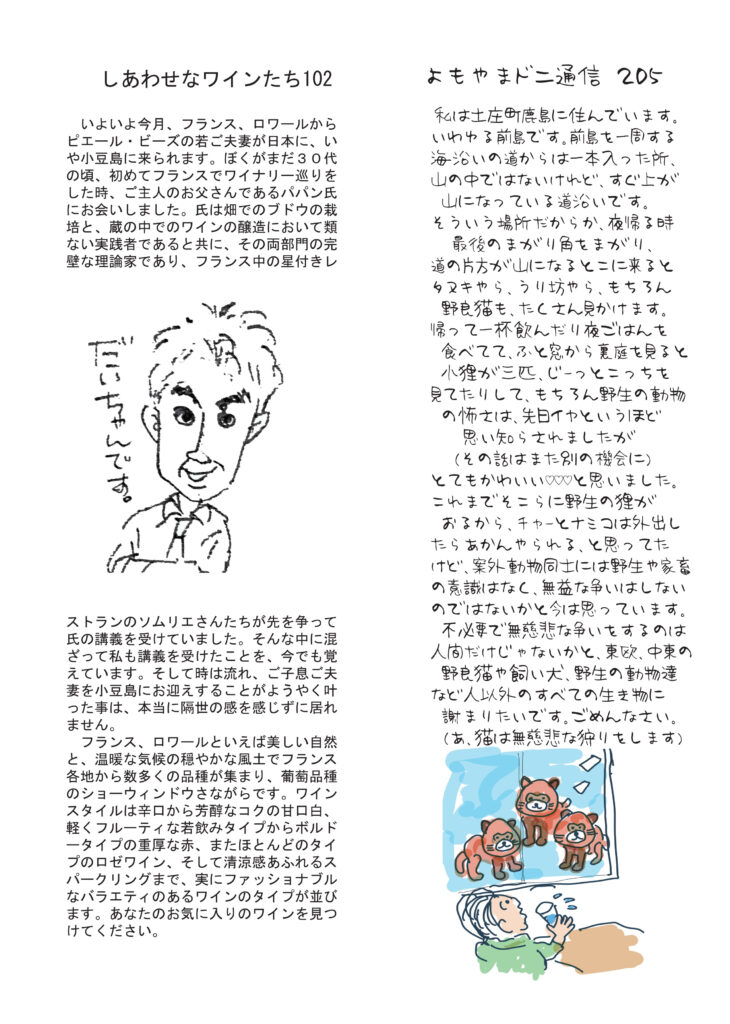 最初のページはめちゃくちゃうれしかったこと。本当に涙が溢れました。いろいろたいへんだけどがんばろうと思いました。清酒の話は「今年の漢字」に残念だった件。それでも日本酒造りは素晴らしい文化財です。ワインの話は正月に来日され小豆島まで来てくれるピエール・ビーズさんについて。鹿島は野生動物が多い話。仔狸はかわいいです。ちょっと思った伝統に固執するか、アップデートするかについて。好評連載は、小豆島講座はお正月らしく「石節」、おもしろ草紙は「大人の文化祭」開催のお知らせ。これは見逃せません!