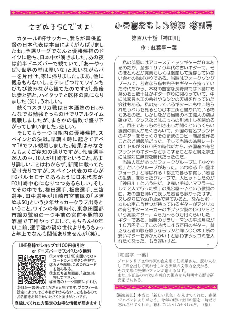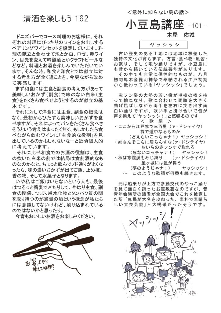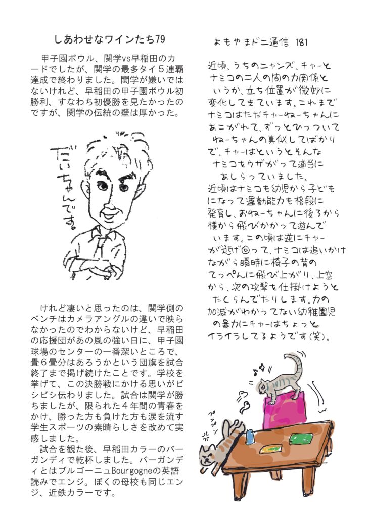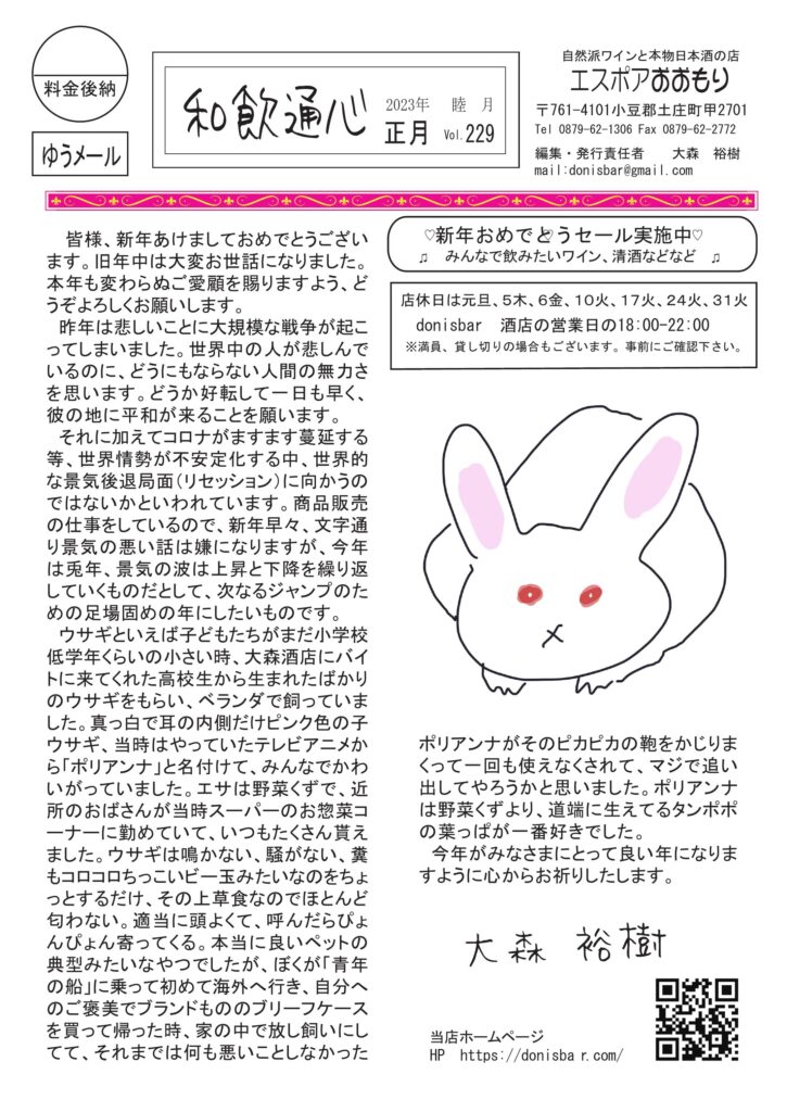 冒頭のお話はウサギ年にウサギの思い出。清酒は献立の考え方日本と西洋の違いについて。ワインのコラムはなぜか甲子園ボウル(笑)。人気のニャンズ話とカタール、サッカーワールドカップの話。人気コラム、小豆島講座は「ヤッシッシ」です。おもしろ草紙は「神田川」ハイ、かぐや姫ですね。