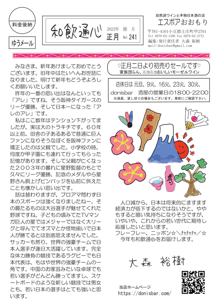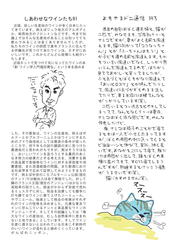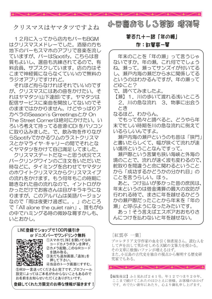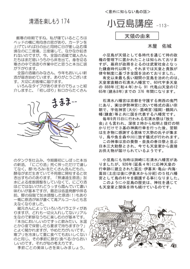 最初のページは去年のアレの話しから日本のスポーツが強くなったことについて。お酒の話はバラエティ豊かな今の時期のラインナップ。ワインは新ワイン学入門という本。ナミコの寝息。クリスマスにヤマタツ。好評連載、小豆島講座は「天領の由来」、おもしろ草紙は「年の瀬」お楽しみください。