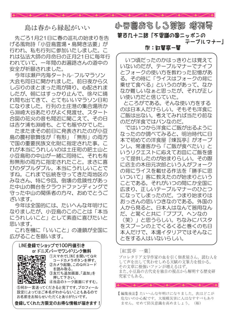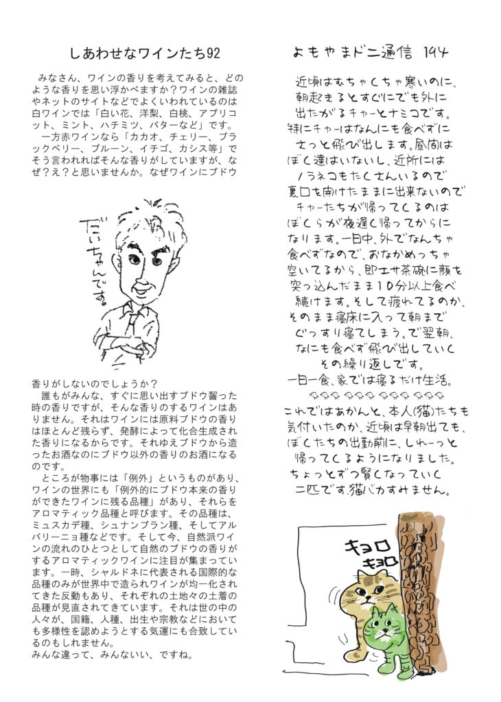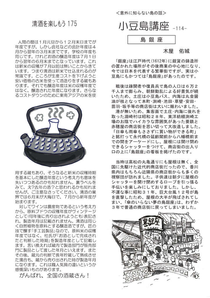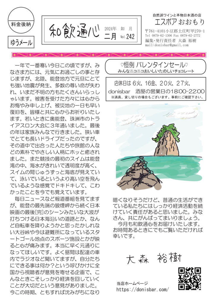 最初のページは能登半島、珠洲へトライアスロン大会に通ってた話。みなさんと共に一日も早く普段の生活に戻ることを祈りたいと思います。清酒の話は、醸造年度。6月末が大晦日です。ワインはアロマティック品種について。猫の話しは夜遊びが過ぎる二匹。えーがげんにせー。小豆島の歌舞伎舞台が重要民族文化財に選ばれた話。好評連載は小豆島講座が「島銀座」オドロキです!おもしろ草紙は「不思議の国ニッポンのテーブルマナー」なんと最初は、、、、なんて(笑)。どうぞお読みください。