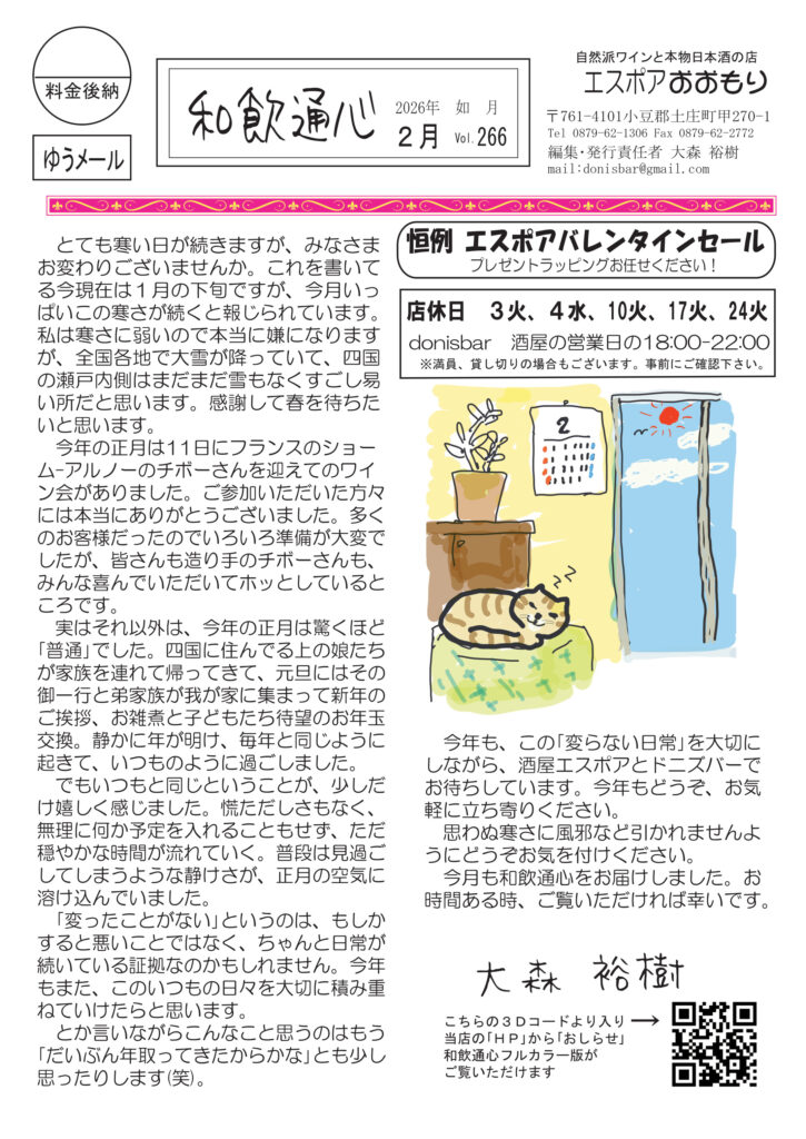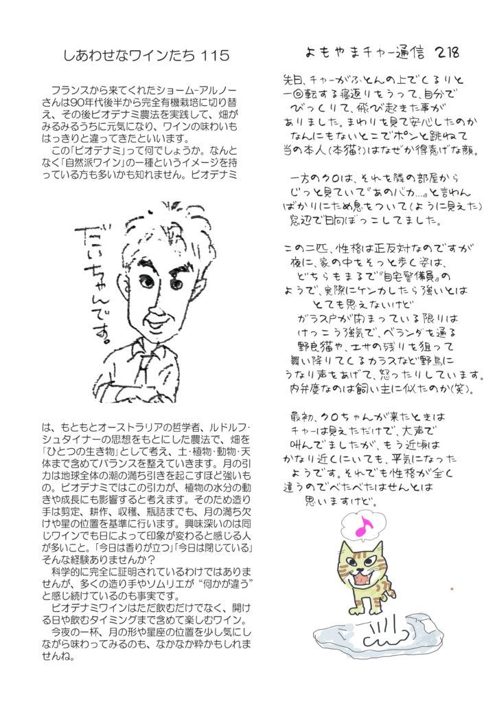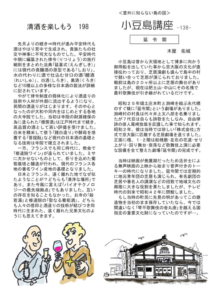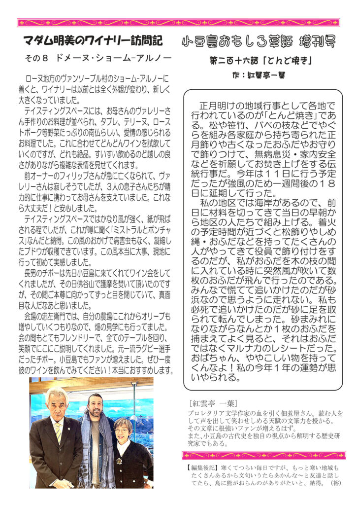 絶賛配布中。表紙は「普段の正月」、いつもと同じが実は大切な事だとなんとなくわかってきた自分。日本酒の話は歴史の続き。今月は平安時代、僧房酒。同時期にフランスでは修道院でワイン造り。同時期になぜ?ワインはショーム-アルノーの「ビオデナミ」ってなに?チャーの話は性格真反対な二人、なんとかやってます。明美のワイナリー訪問記もショーム-アルノー。 好評連載、小豆島講座は「延令閣」ぼく自身、うっすら覚えています。おもしろ草紙は「とんど焼き」おもしろーいです。