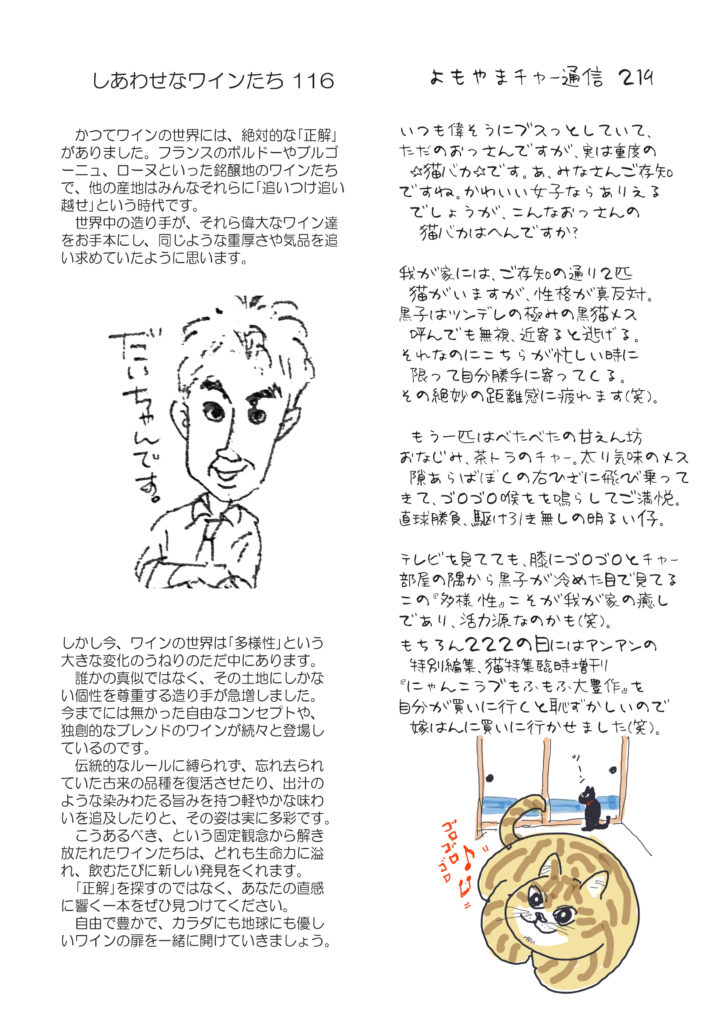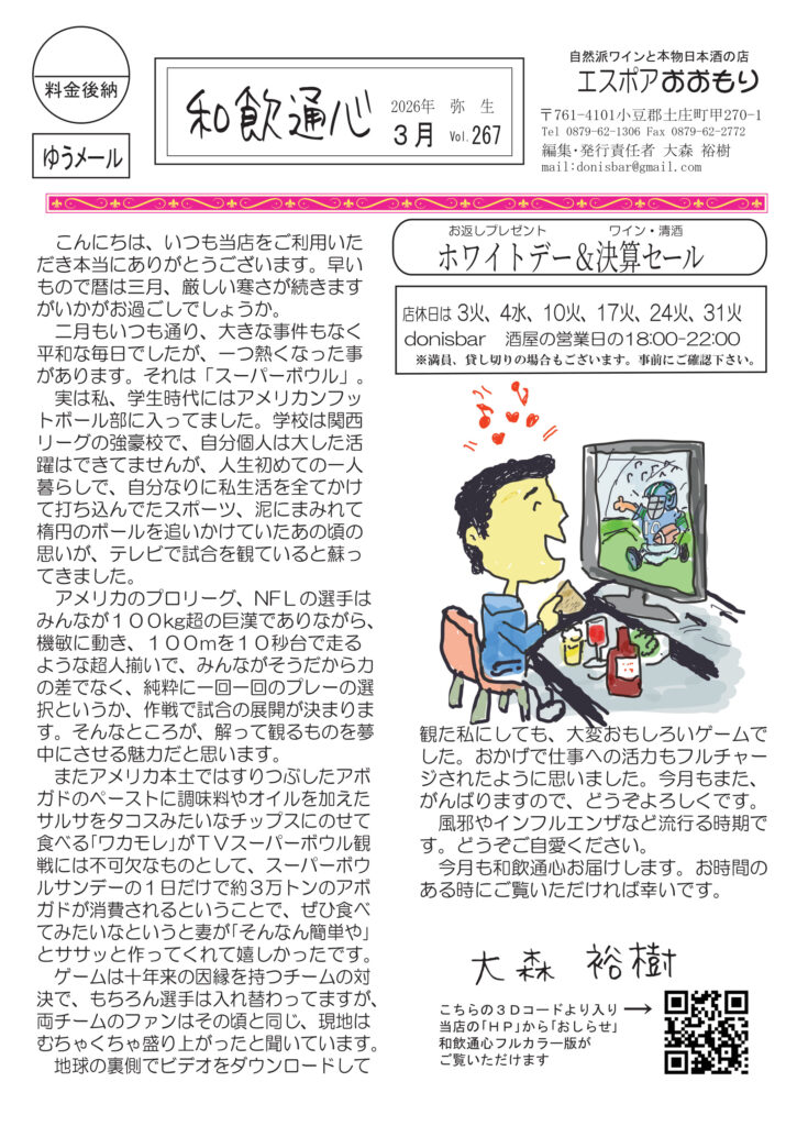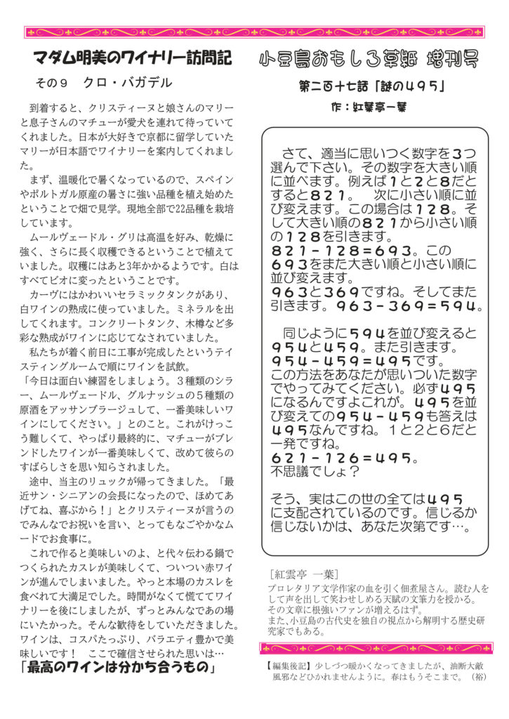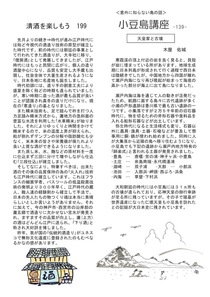 最初のページはスーパーボウルの話。おもしろかったですね。清酒のコラムは歴史の続き、江戸時代。ワインは多様性のうねり。ネコ話は性格、正反対の二匹。明美のワイナリー訪問その9は南仏の雄、クロ・バガテル。好評連載、小豆島講座は「天皇家と古墳」なぜか天皇家とつながりの深い小豆島。おもしろ草紙は不思議だがなぜかそうなる「謎の495」。