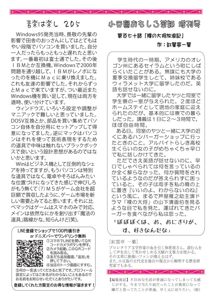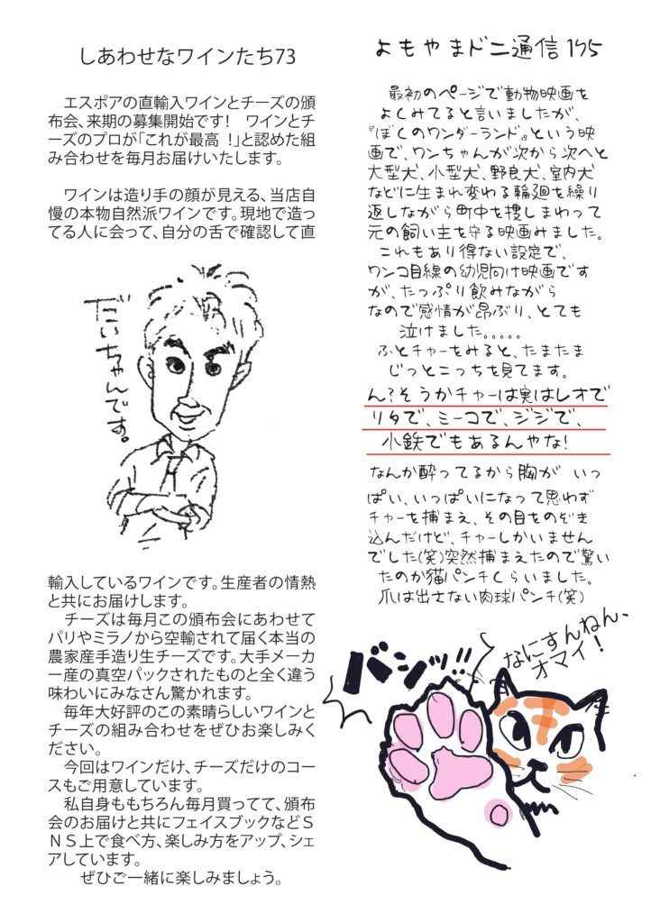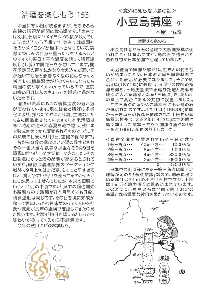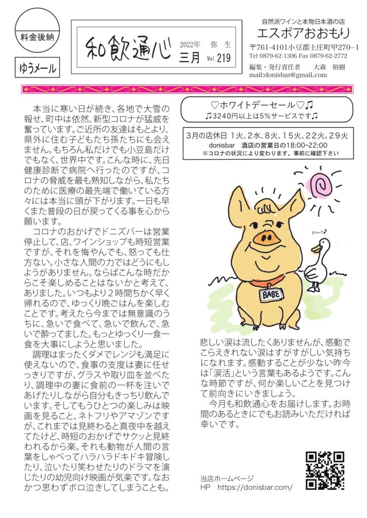 今月はコロナに負けず家で映画の話。小豆島講座は三角点の石について、おもしろ草紙「裸の大将」爆笑必至。清酒の話は「熟成と積算温度」、ワインは頒布会のオススメです。←これマジ、やばいですから。チャーに猫パンチ喰らった話、そしてオッサンのパソコン歴、などなど話題豊富です。このサイトで初めて見る方も、おうちに届いている方もフルカラー版をお楽しみください。