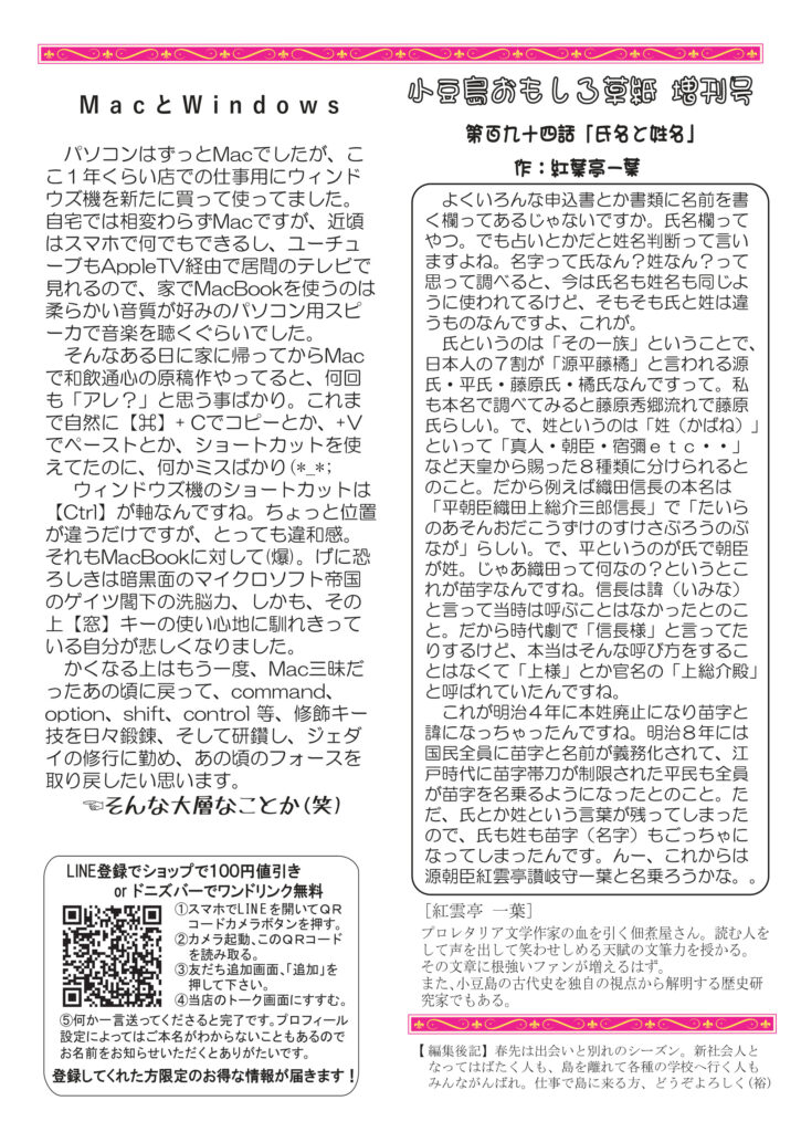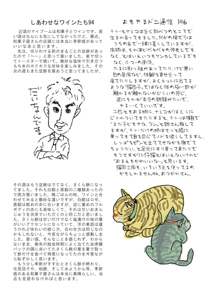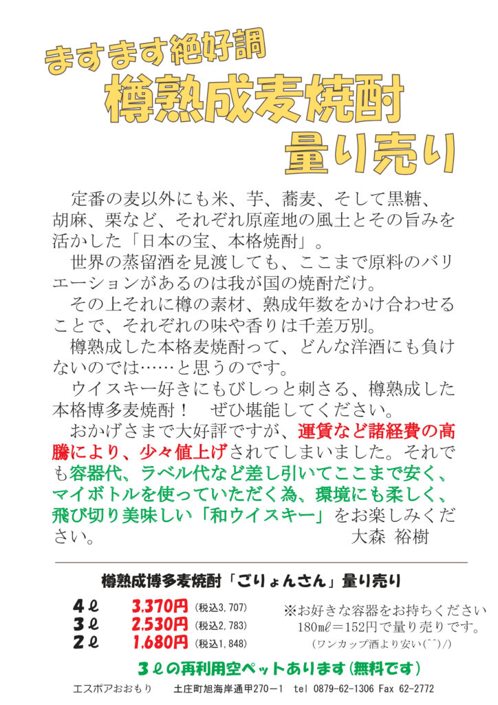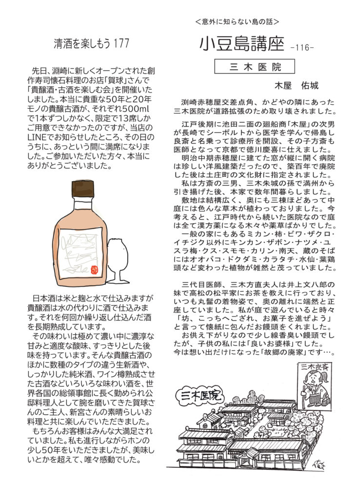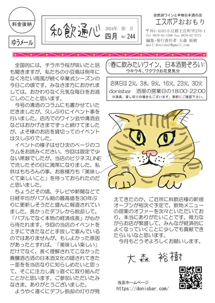 絶賛、配布中です。最初のページはひさびさの店外イベントのお話。貴醸酒古酒を楽しみました。清酒の話もそのことについて。ワインの話はマイブームだったピノノアールと桜もちの相性について。ネコバカ話はいつもの通り。すみません(笑)。ちょっとイラっとしたMacとWindowsについて。好評連載、小豆島講座は「三木医院」あの貴重な文化財だった赤穂屋の三木医院跡のこと。おもしろ草紙は「氏名と姓名」目から鱗です。オマケに大好評の量り売り樽熟成麦焼酎ごりょんさんのチラシも入れときました。ぜひご覧ください。