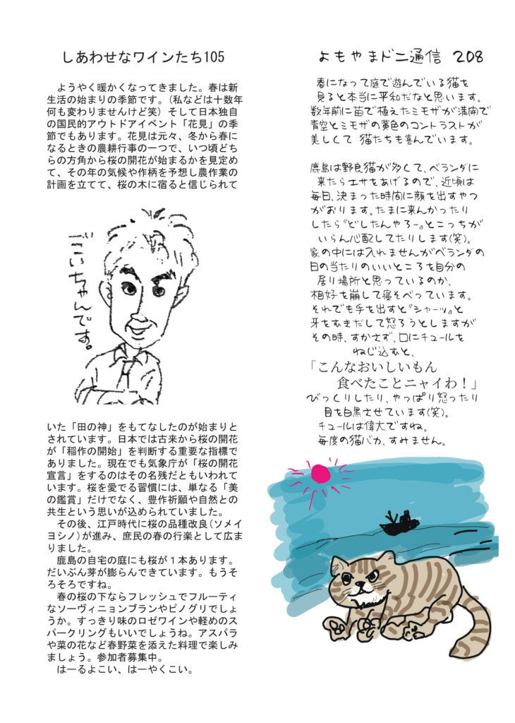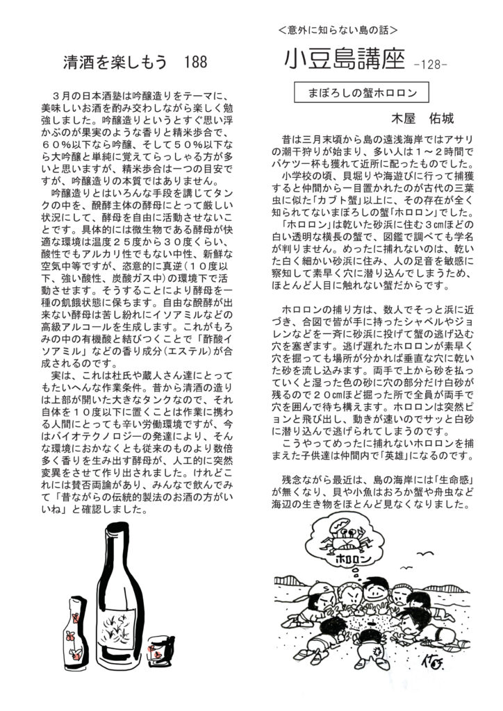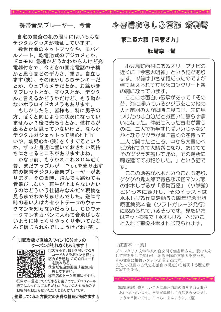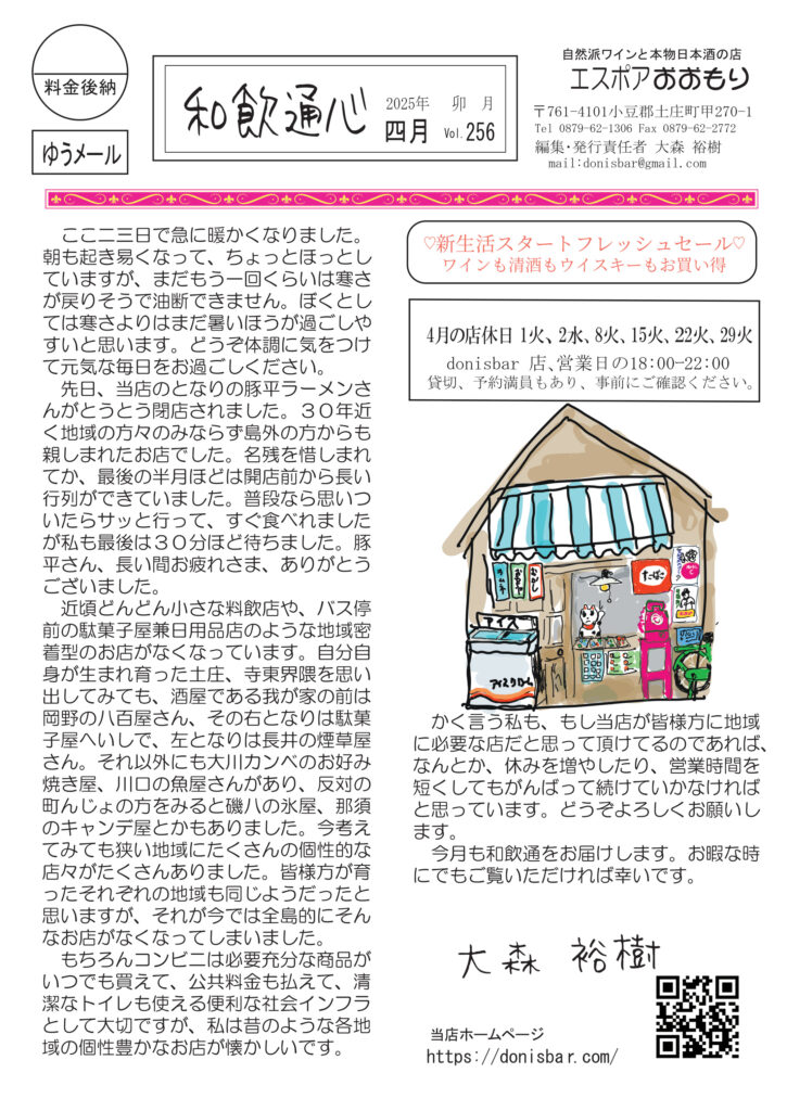 絶賛、配布中です。最初のページは、地域のお店がどんどん無くなってさみしいなあと思ってること。思い出してみると、通心に書いた他に、内科病院、製麺所、大工さん、宿屋、自転車屋、散髪屋、和菓子屋、牛小屋、養豚場、ガラス屋、元校長先生がやってる学習塾、銭湯は二軒、印刷会社等々たくさんありました。挿絵に凝りました。店の右前はオロナミンcとボンカレーの看板のつもり。清酒コーナーは吟醸酒の本質について。ワインコーナーはワインをもって花見に行きたいねの話。ネコ話は「チュール最強説」。ひとり言は携帯音楽プレーヤーの今と昔と大昔。好評連載は小豆島講座は「まぼろしの蟹ホロロン」これは私も見たことないです。おもしろ草紙は「今宮さん」絶対にググってみたくなりますよ。