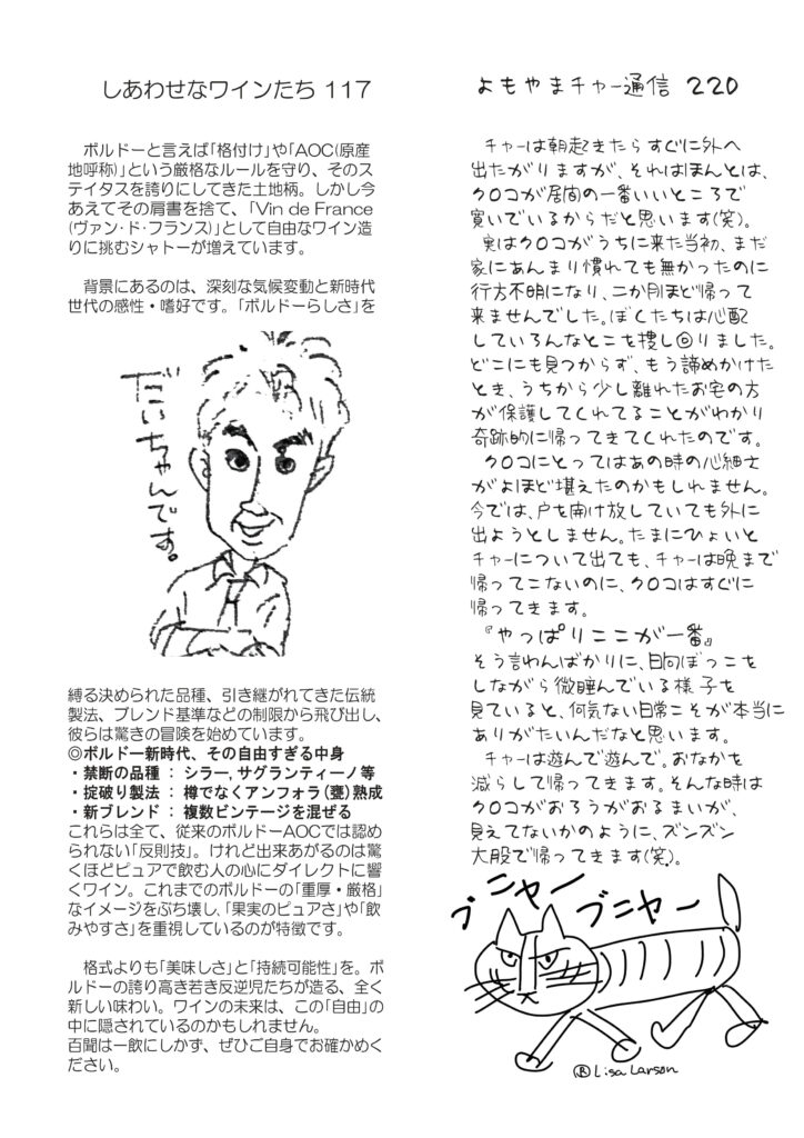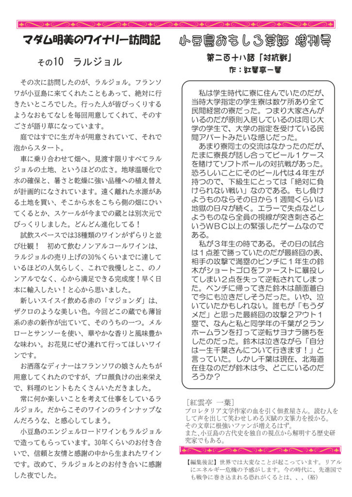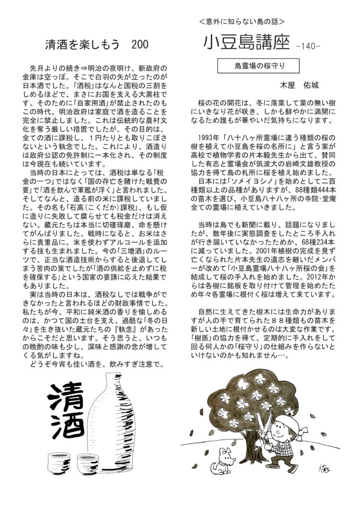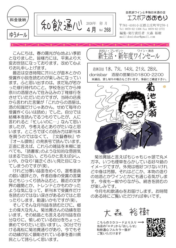 絶賛配布中です。最初のページは文学賞作品を読む楽しみと、菊池寛さんについて。月刊誌の発表号で読んでます。清酒の話は歴史の続きで明治以降、大変な時代でした。ワインはボルドー新時代、伝統の重厚さ・厳格さを捨てて新時代に対応しようとする新しいボルドー。猫の話は最初2週間行方不明だったクロコのこと。明美の訪問記はラルジョル。好評連載、小豆島講座は「島霊場の桜守り」、おもしろ草紙は「対抗戦」。ぜひお読みください。