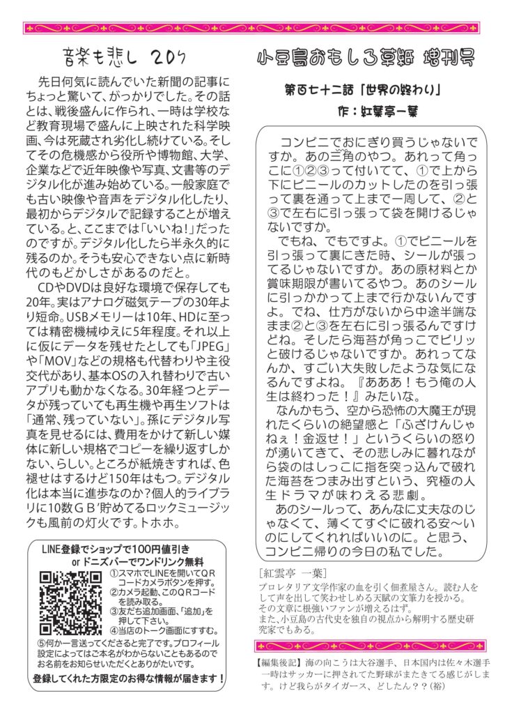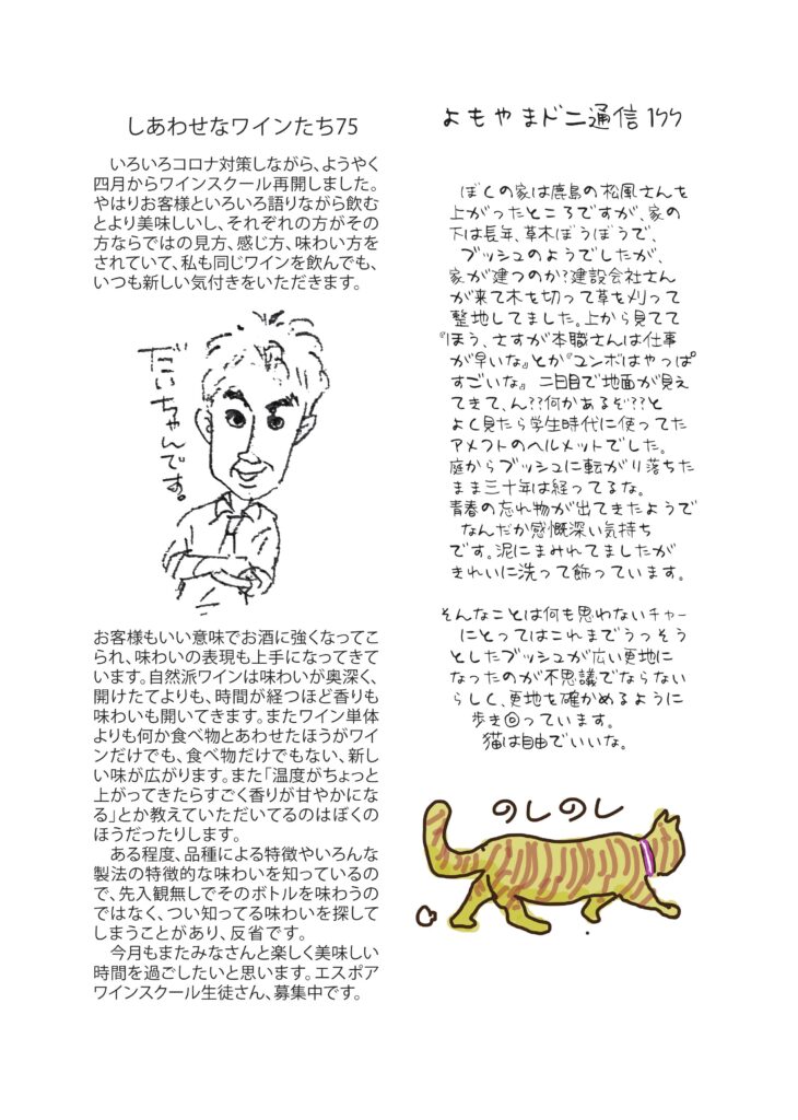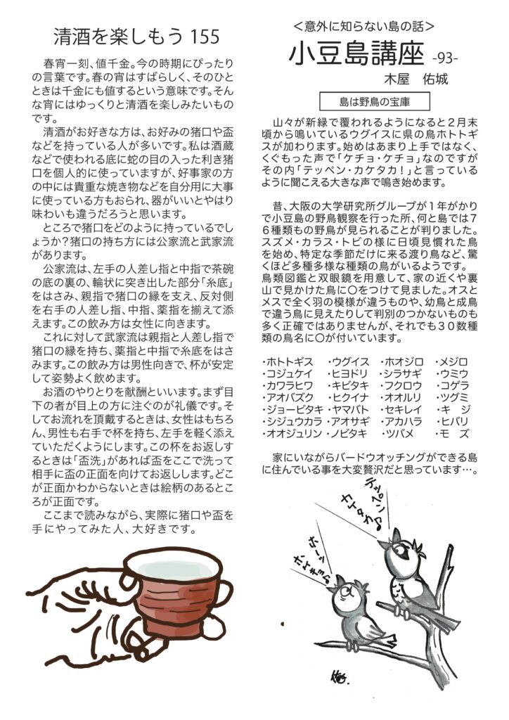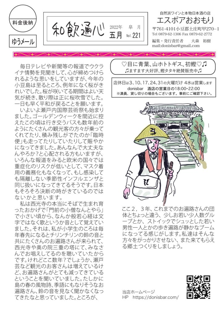 実はちゃんと四月中にできて配り終えていたのになんだか気忙しいGWでお知らせをあげるのを忘れてました。 お遍路さんの話、盃や猪口の持ち方、小豆島講座は「島は野鳥の宝庫」、ワイン会、ブッシュにヘルメット?!、おもしろ草紙は「世界の終わり」、デジタルは進化?? など盛りだくさん。お暇な時にでもお読みいただければ幸いです。