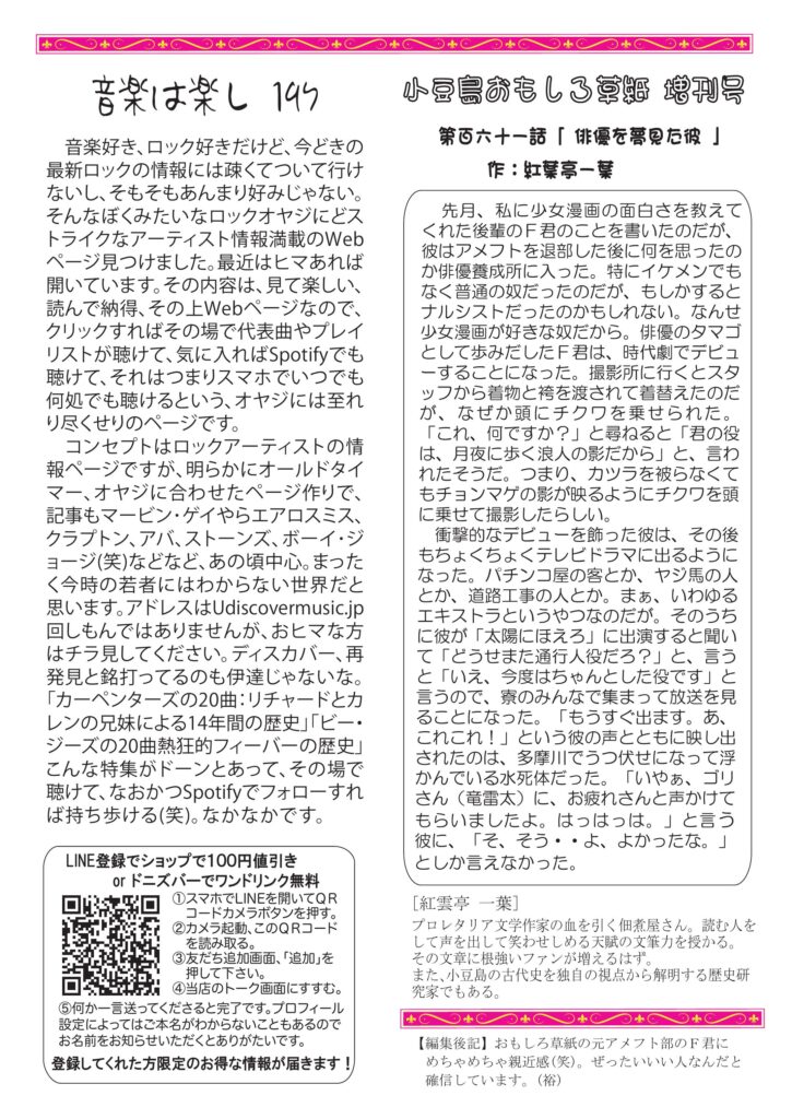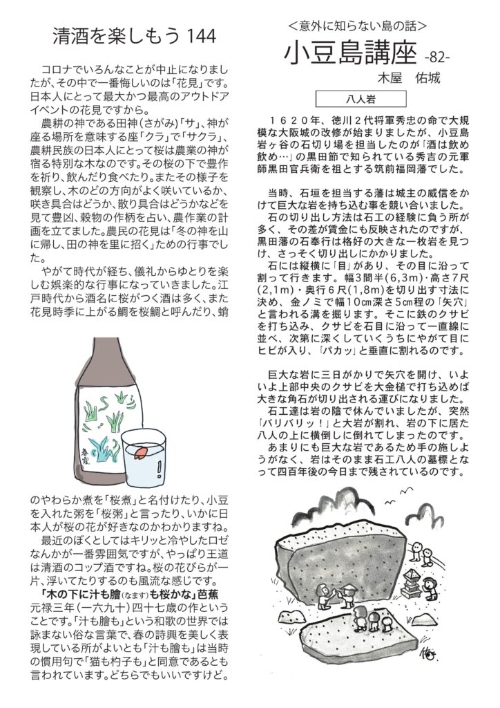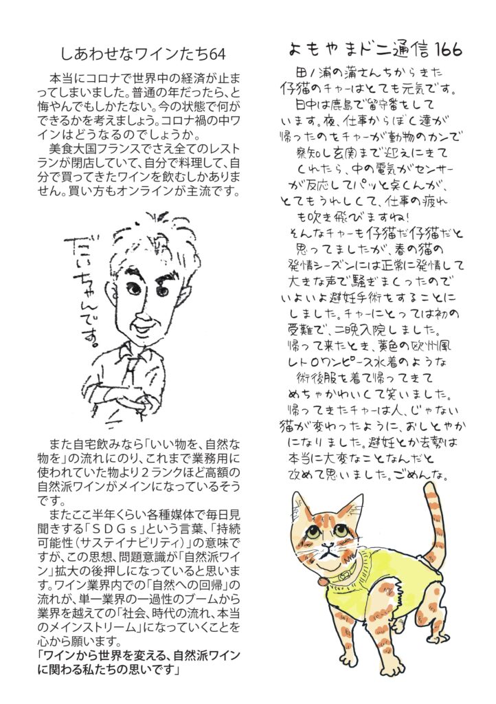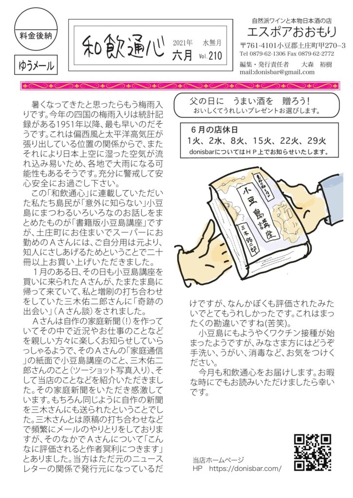 毎月お客様に配っている当店のニュースレター「和飲通心6月号」です。 小豆島講座本の話、講座は八人岩、チャー避妊手術、コロナ禍のワイン業界事情、おもしろ草紙は例のF君!などなど盛りだくさんです。お暇な時にでもご覧いただければ幸いです。