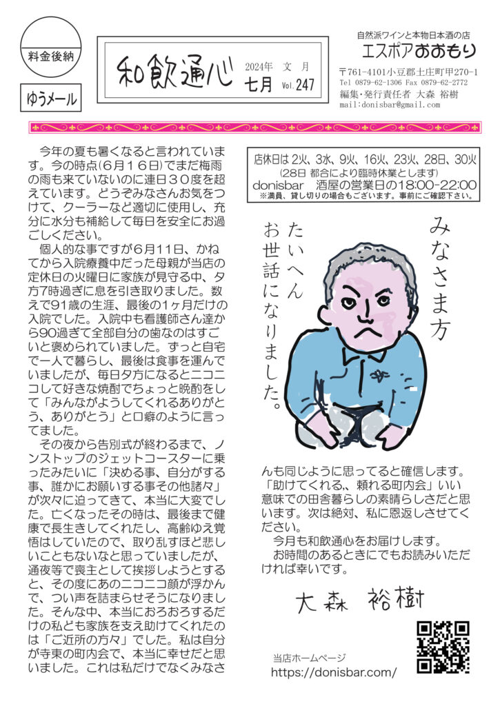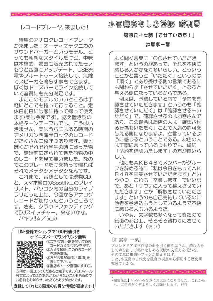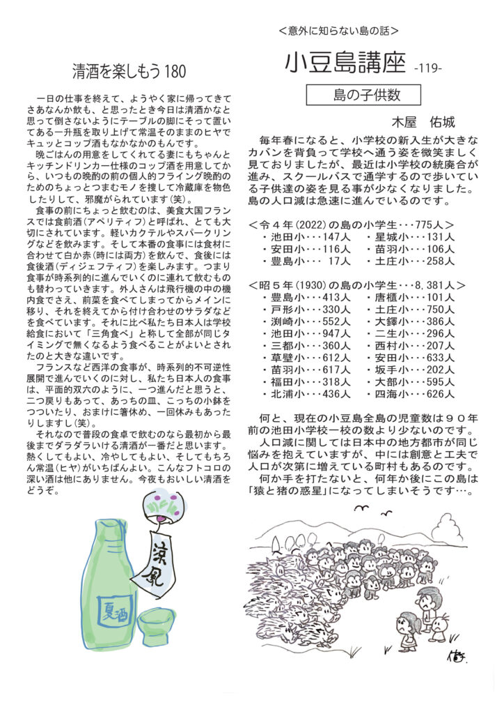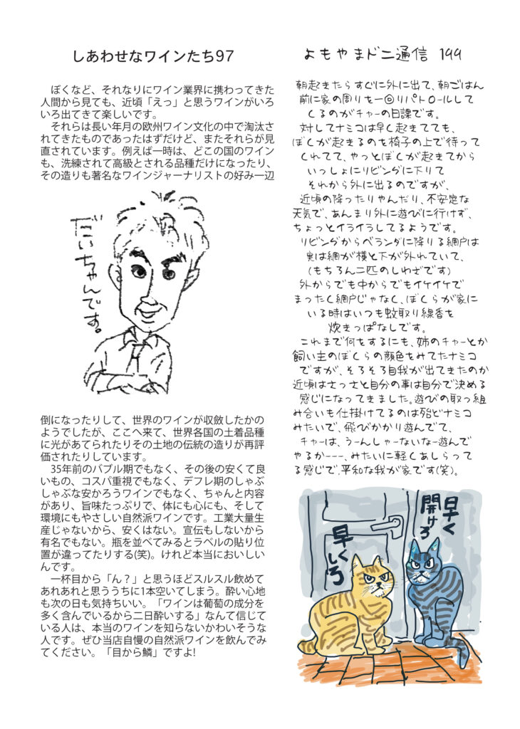 最初のページは、ご報告。お気遣いの無きよう、お願いいたします。清酒の話は西洋と日本の食事の進め方の違いについて。ワインの話は、多様性の時代、みんな違って、みんないい、世界のワイン、日本のワイン。ネコ話は自我が出てきたナミコの事。近頃のマイブームはアナログレコードプレーヤでLPレコード聴くこと。好評連載、小豆島講座は「島の子供数」ここらでなんか手を打たないと。おもしろ草紙は「させていただく」不思議なフレーズ、謙ってるようで実はマウント取ってて不快な言葉?必読です。