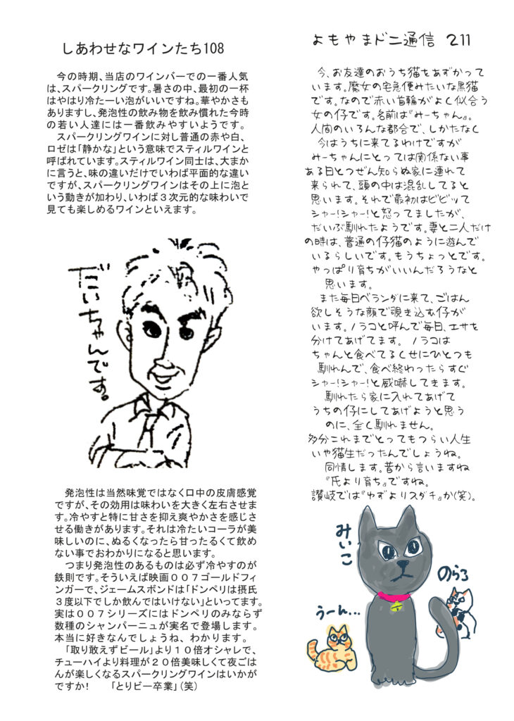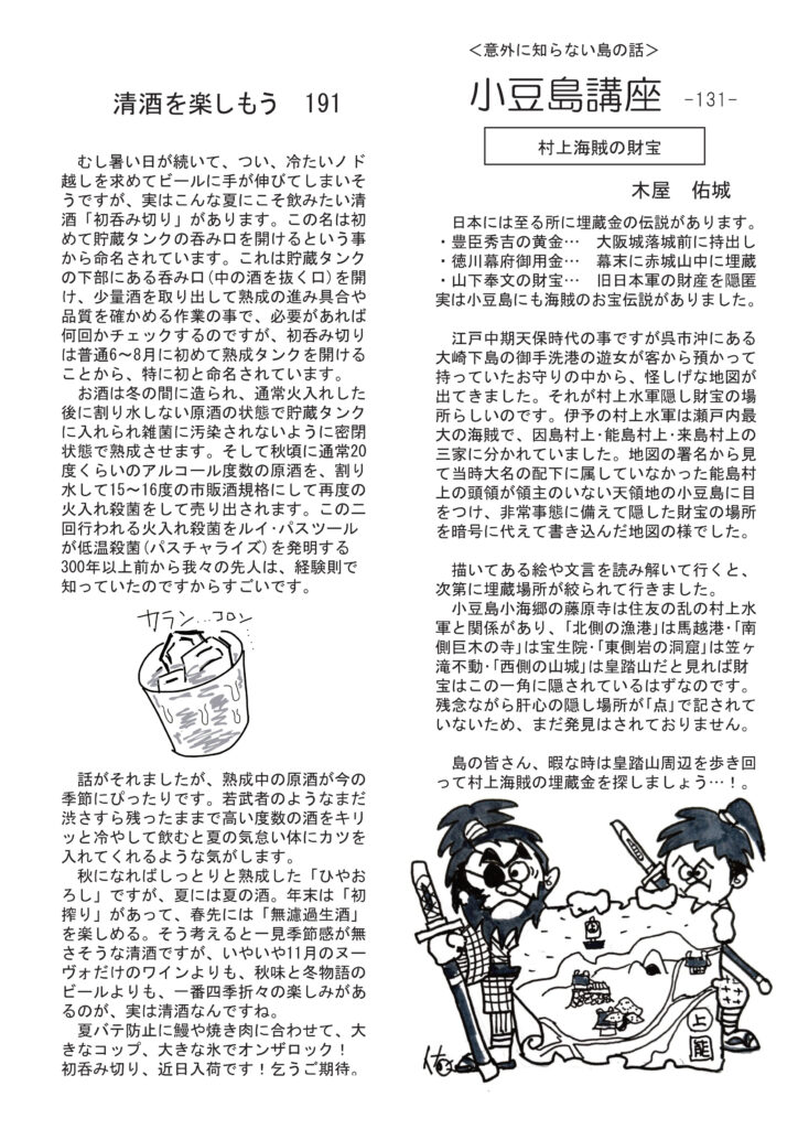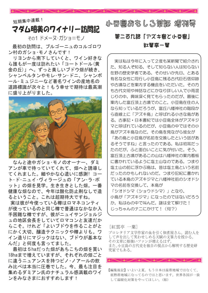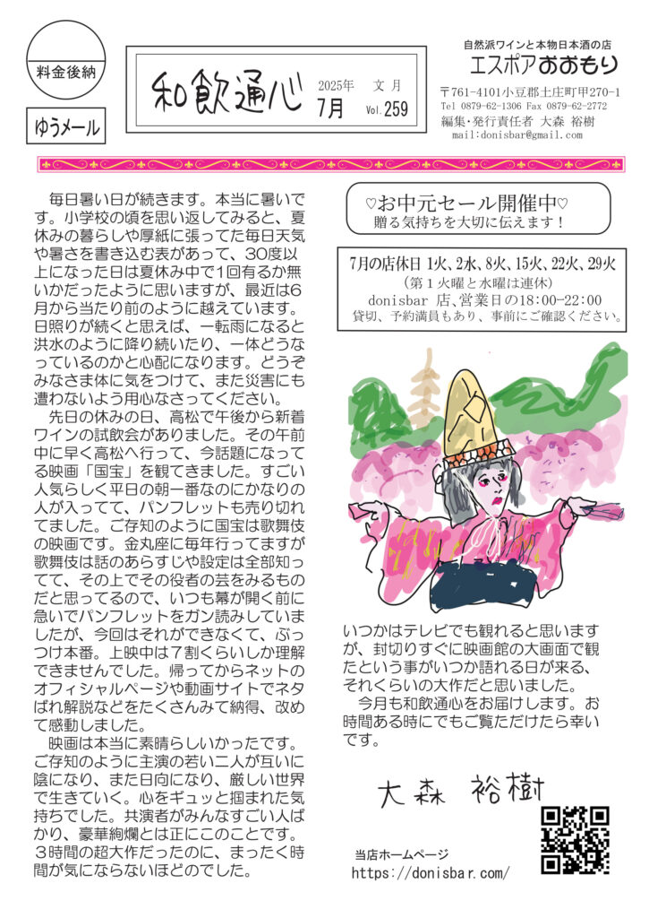 配布中です。こちらでフルカラー版、ご覧ください。1面は映画「国宝」とても感動しました。みなさまもぜひ。おすすめします。清酒の話は「初呑み切り」夏には夏の酒があるのです。ワインは「スパークリング」とりビーを卒業しよう。ニャンコの話、今あずかっている「みーちゃん」のこと。明美のワイナリー訪問記は最初の蔵「ガショ=モノさん」すごいです!挿絵もAIでジブリ風。好評連載は小豆島講座「村上海賊の財宝」宝さがしやってみる? おもしろ草紙は「アズキ島と小豆島」おもしろ不思議な世界です!