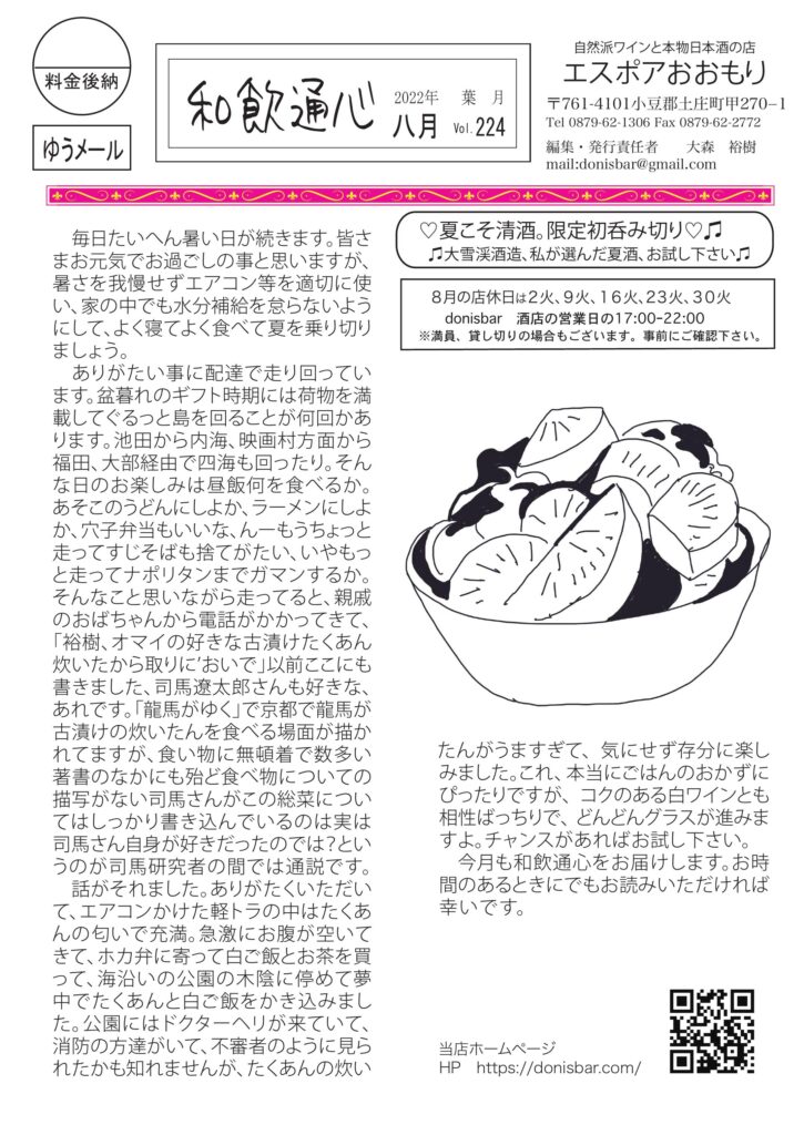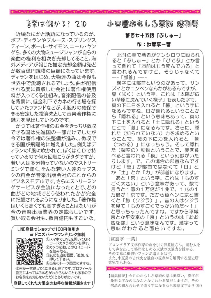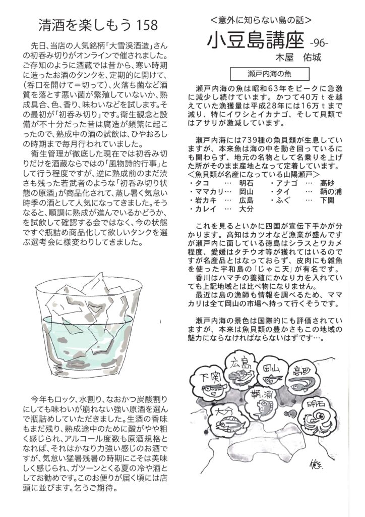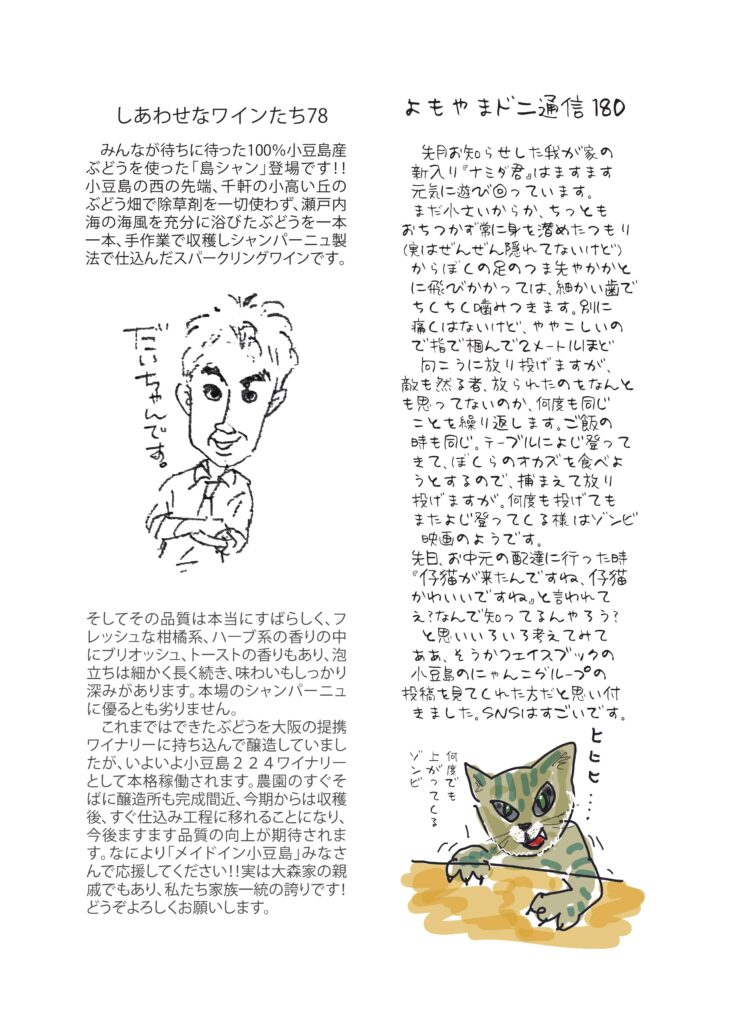 司馬遼太郎さんも大好き?タクアンの炊いたん話、清酒は大雪渓、初呑み切り。小豆島講座は「瀬戸内の魚」、ワインは「大好評、島シャン」、チビ猫ゾンビ。音楽は儲かる話、おもしろ草紙は漢字のブシュー。毎月届いてるよの方もフルカラー版をお楽しみ下さい。