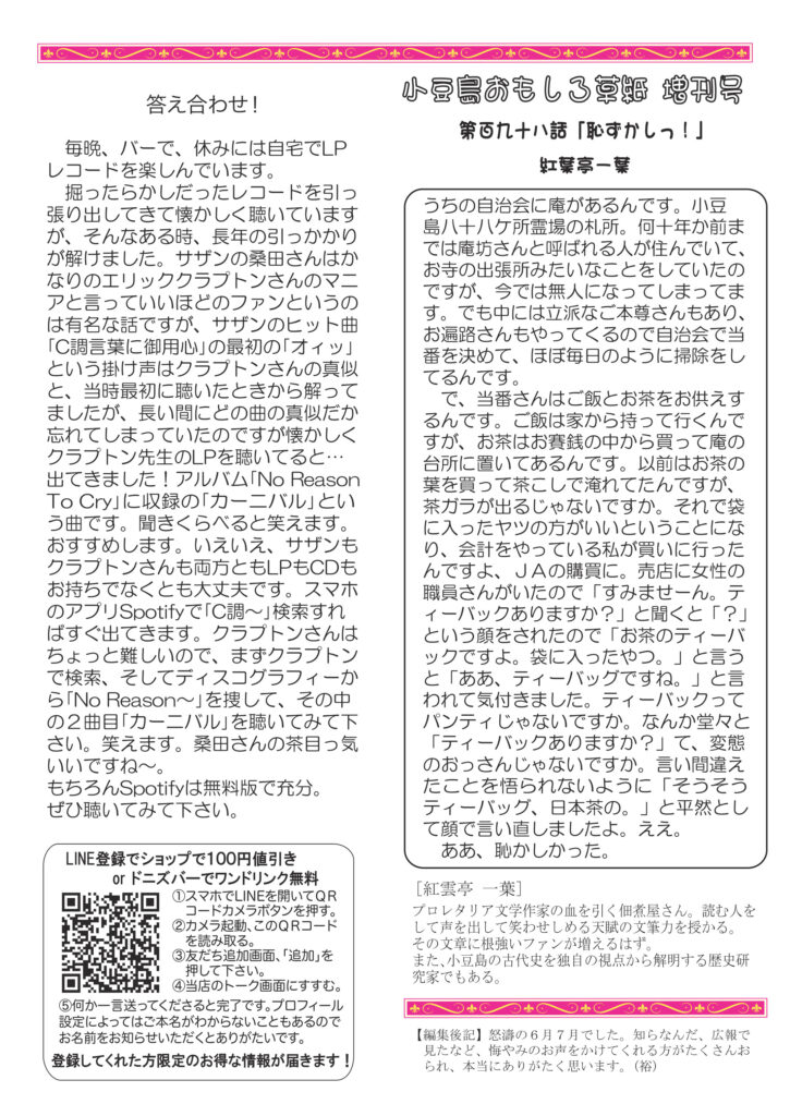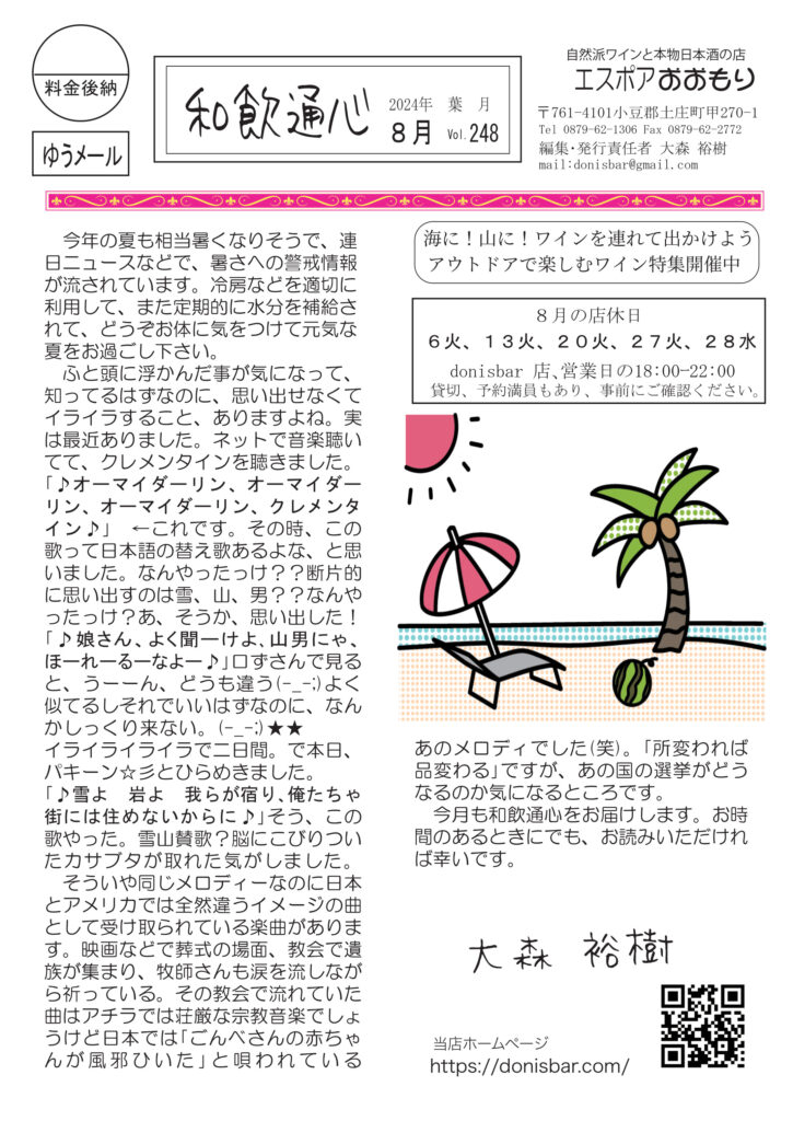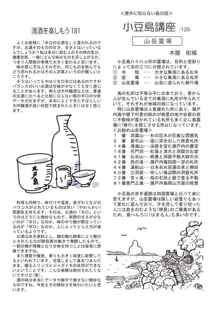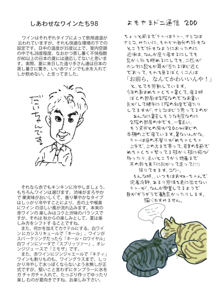 最初のページは、寄る年波か、ふと頭に浮かんだこと、知ってることなのに、どうしても思い出せなくてイライラした話。時々ありますよねー。お酒の話は辛口ってなんだろうと考えてみる話です。ワインは、異常な暑さの中のワインの楽しみ方のご提案です。ネコ話は、いつも落ち着いてるチャー、実は木登りしてるときは興奮してること(笑)。ミュージックのお話しはサザンの桑田さんがクラプトン先生をパロッてる「あの掛け声」の元ネタは、これだ!ぜひお聴きください。好評連載は小豆島講座「山岳霊場」、おもしろ草紙は「恥ずかしっ」爆笑必至です。