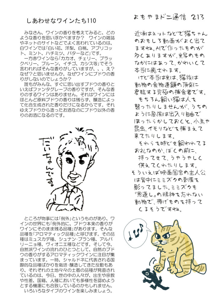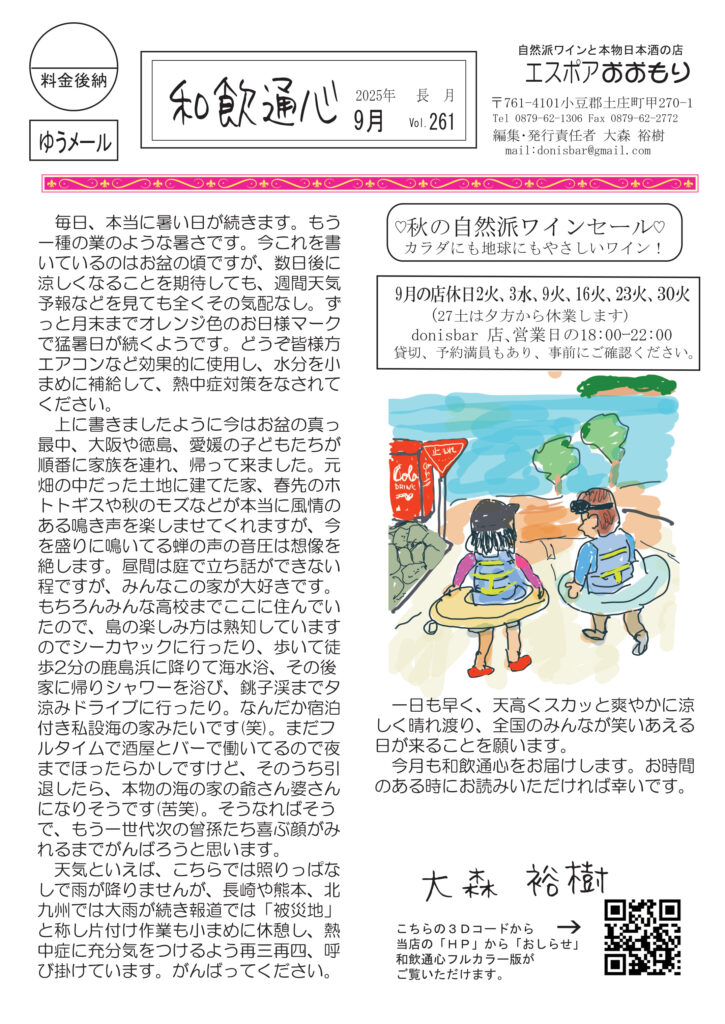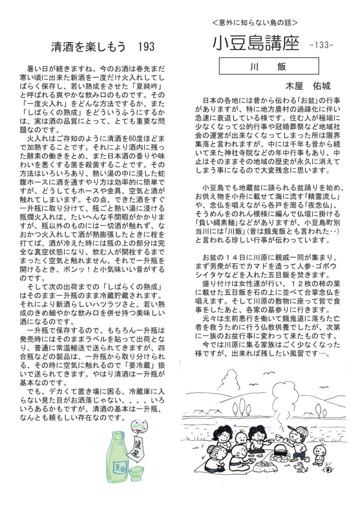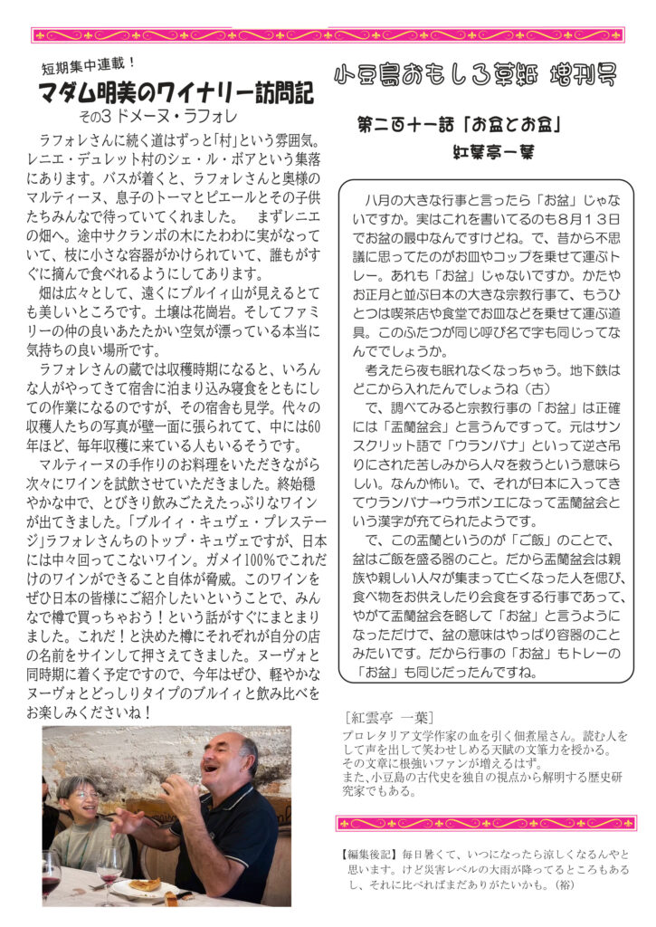 冒頭のお話はお盆に子どもたち孫たちが帰ってきた話。そしてなんと小豆島講座が「川飯」、おもしろ草紙が「お盆とお盆」申し合わせ訳でもないのに、完全にお盆特集号(笑)になりました。なんだかとてもうれしいです。清酒は一升瓶のこと。ワインは香りのこと。ネコの話は貢物を持ってくる話。ワイナリー訪問記はボージョレのラフォレさんです。