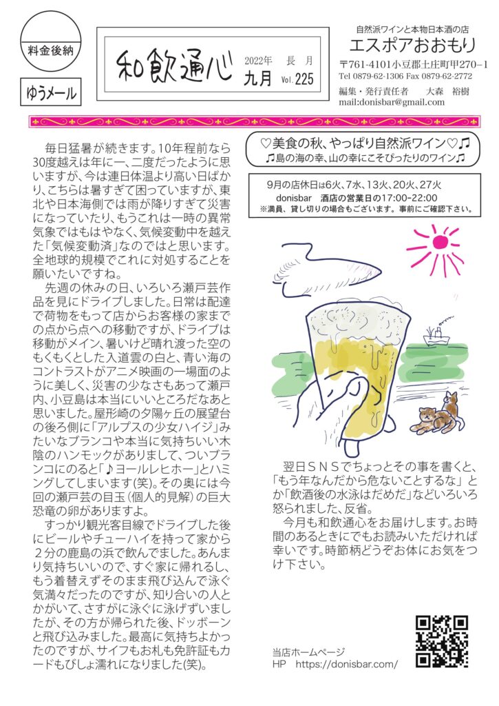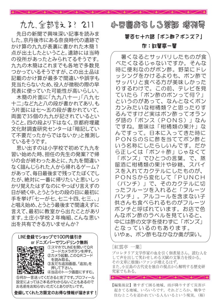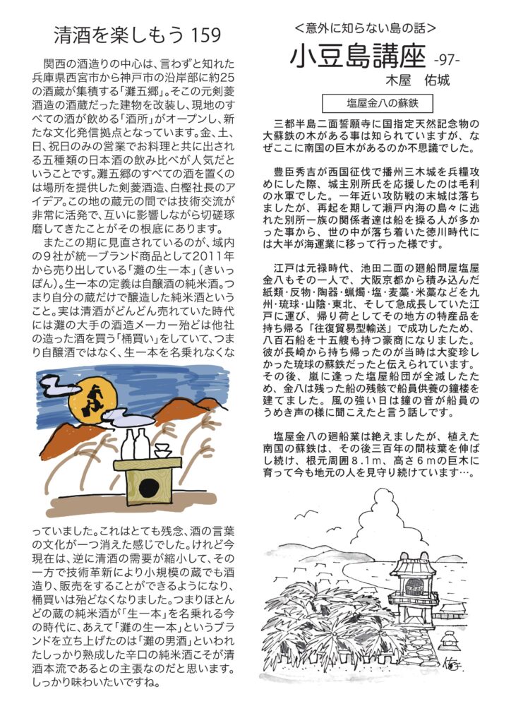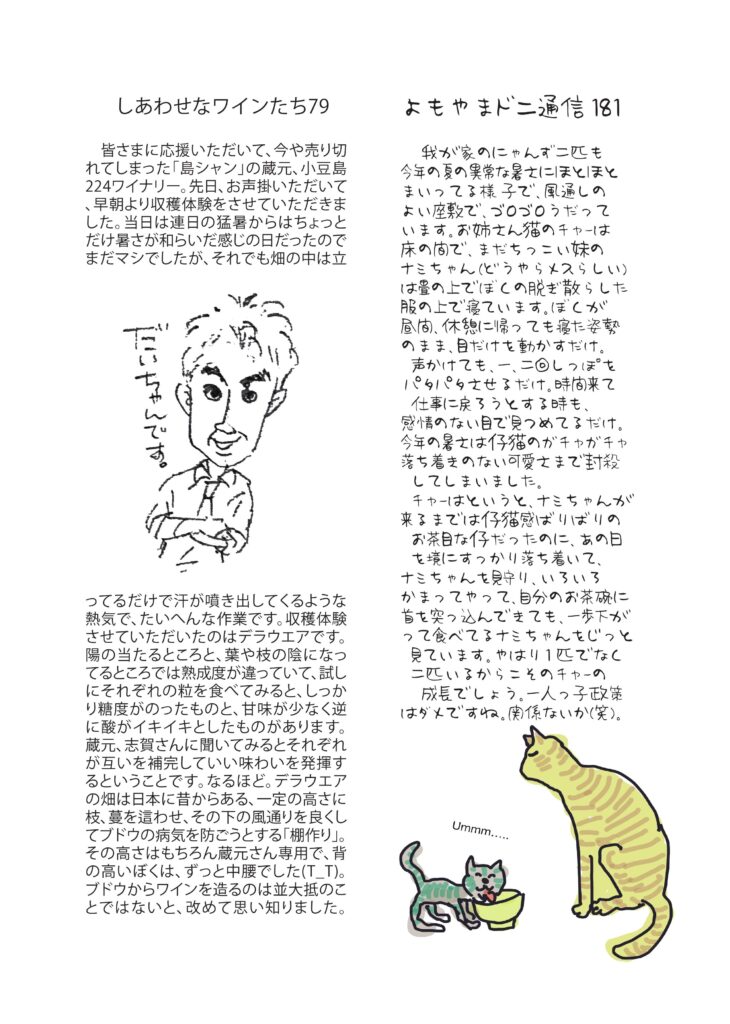 最初のお話は、鹿島でオヤジスイミング、清酒は「灘の生一本」、ワインは224ワイナリーで収穫体験、にゃんこたちの成長記録、九九全部言えますか?人気の連載、小豆島講座は「塩屋金八の蘇鉄」とおもしろ草紙は「ポン酢?」