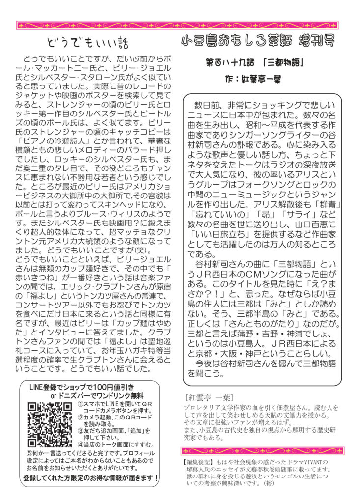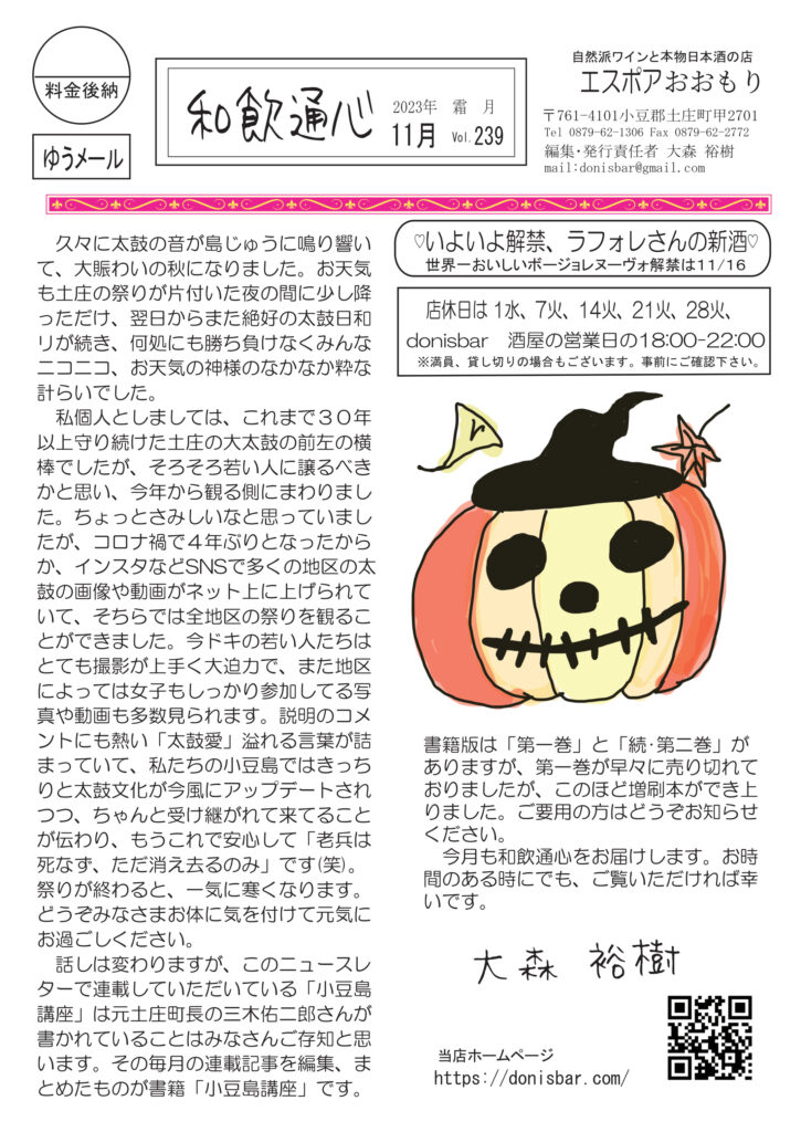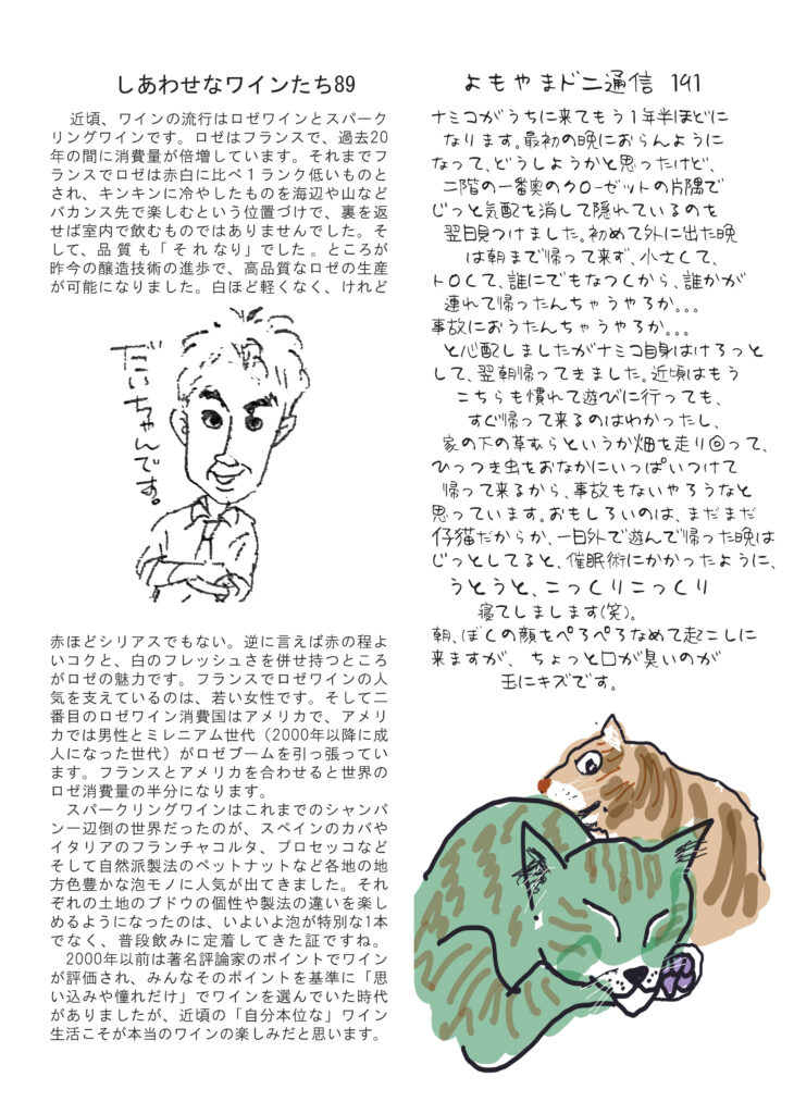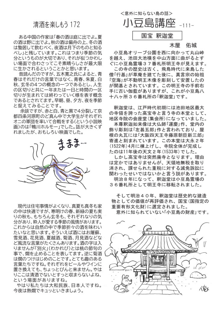 最初のページはやっぱり太鼓祭り。重大発表あり(笑)。清酒でないと決まらない世界がありますよね。やっぱり我々日本人。ワインは、近頃人気のロゼとスパークリングの話し。ニャンコたちの日常話。猫バカすみません。どうでもいいはなしをひとつ。好評連載、小豆島講座は「国宝 釈迦堂」。おもしろ草紙は「三都物語」小豆島では「みと」ですよね。