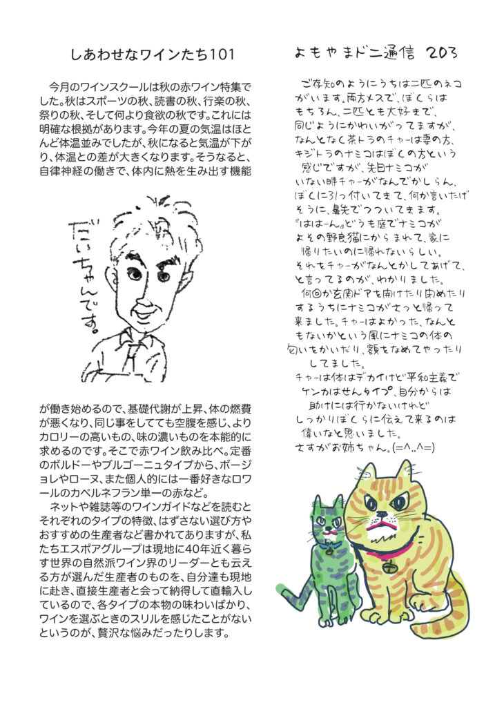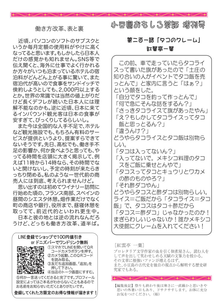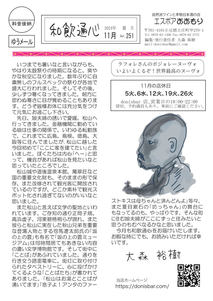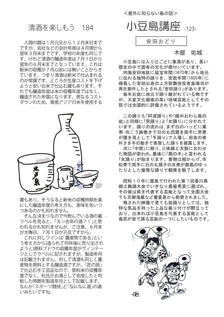 最初のページは、松山へ行ったこと。松山城や道後温泉等々、観光スポットも素晴らしいけど、なにより文学の聖地として素晴らしい。街の人々もすばらしい。清酒の話は醸造年度のこと。会社組織の会計年度などのように、醸造の世界にも年度があります。ワインは秋の赤ワイン特集。ネコ話は体はデカくても心優しいチャーのこと。それと働き方改革について思ったこと。好評連載は、小豆島講座は「安田おどり」たいへん文化価値が高い地域芸能です。おもしろ草紙は「タコのクレーム」これぼくも勘違いしてました(笑)。