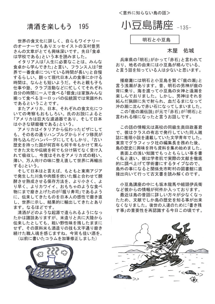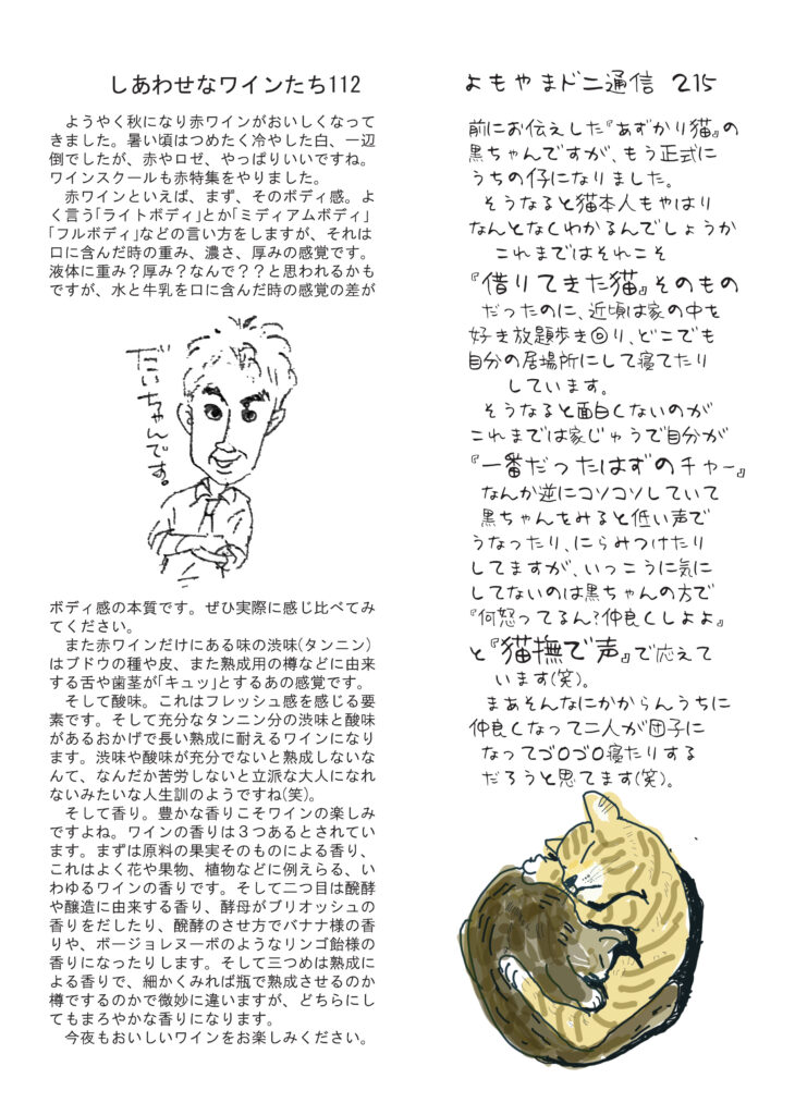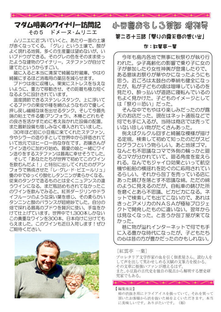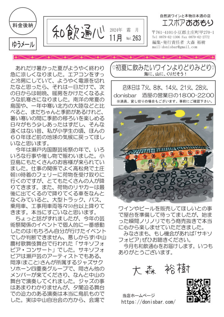 絶賛配布中です。最初のページは瀬戸芸関連イベントで観たサキソフォビア。本当に最高でした。清酒の話は玉村豊男さんの本の紹介。めちゃくちゃ面白い。ワインの話は赤ワインの楽しみについて。急に涼しく?寒くなって、赤ですね。ニャンコの話は、うちの部屋子になる黒子、喜久雄じゃないですよ(笑)。マダム明美のワイナリー訪問は「その5 ドメーヌ・ムリニエ」昔っから当店イチオシのワイナリー。ますますコスパに磨きがかかってます。好評連載は小豆島講座が「明石と小豆島」。興味深いお話です。おもしろ草紙は「祭りの露天商の思い出」なんだかよくわかります。ぜひご覧ください。