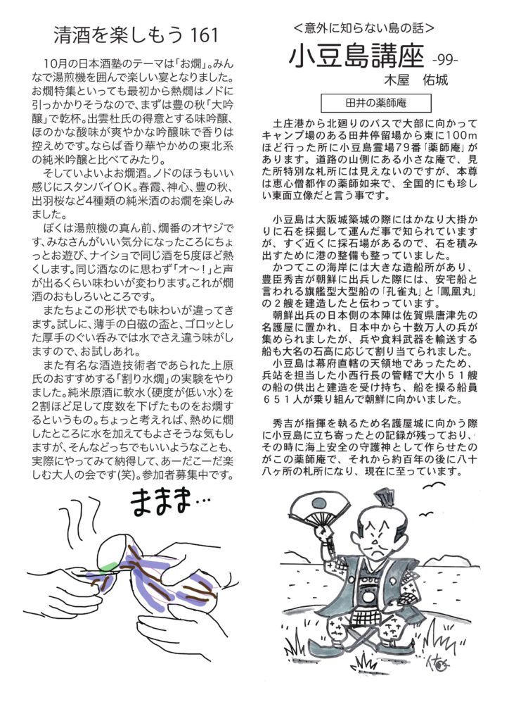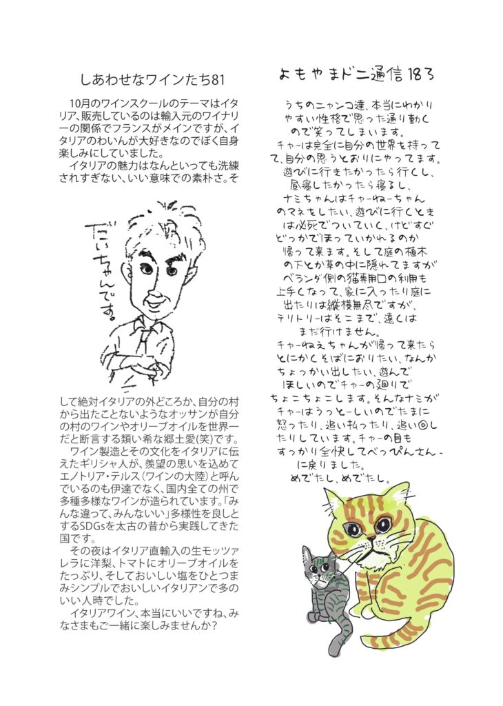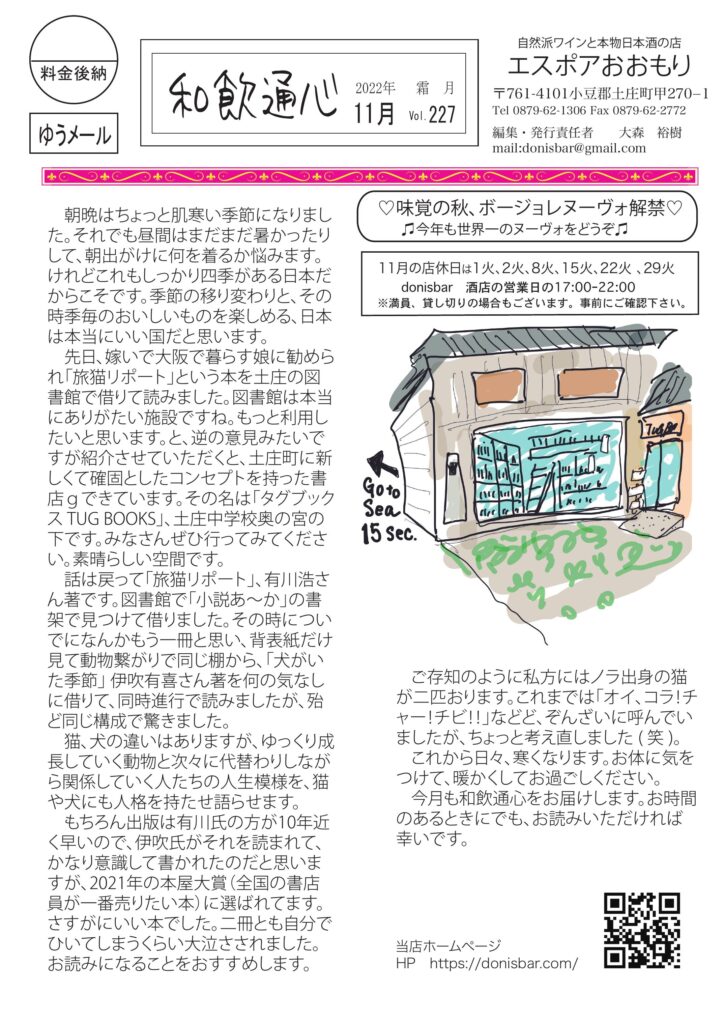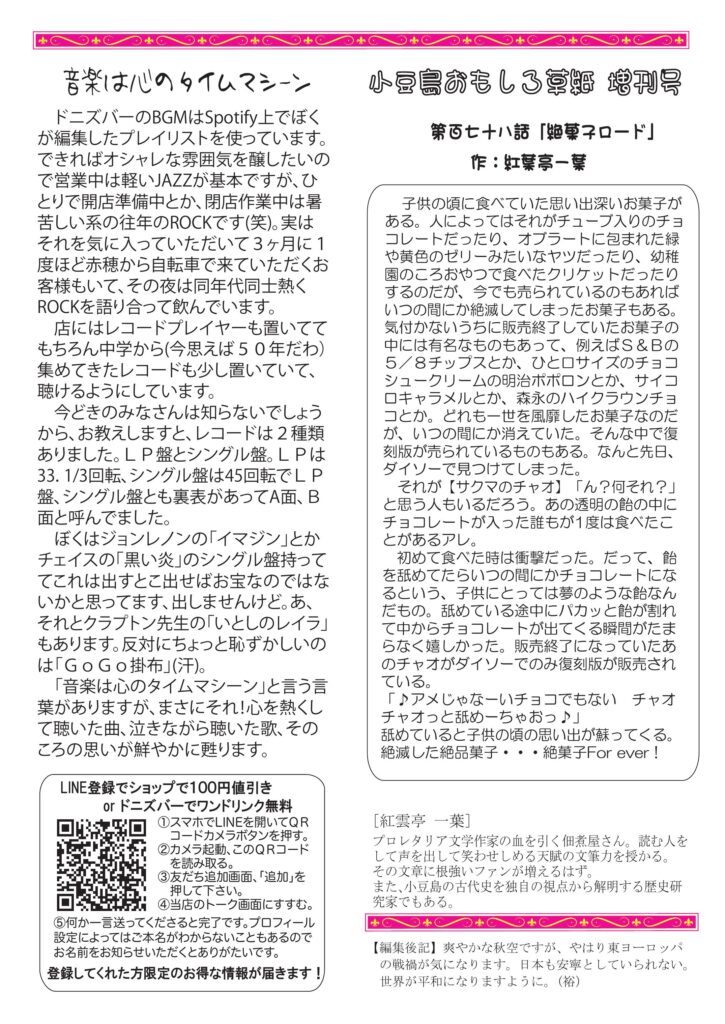 冒頭のお話しは「読書の秋」、清酒はお燗、小豆島講座は「田井の薬師庵」、ワインの話はイタリア、チャーのおめめ治りました。音楽は心のタイムマシーン。おもしろ草紙は「絶菓子ロード」。