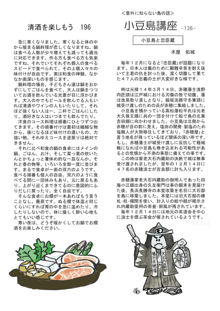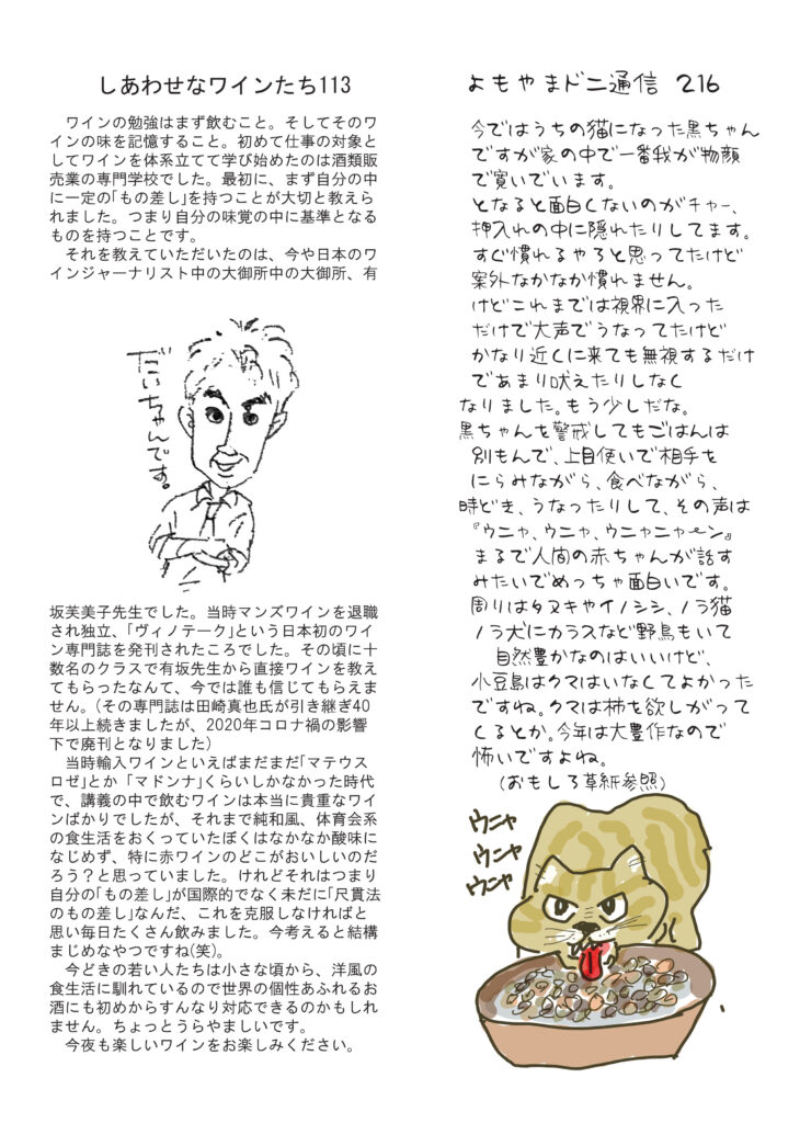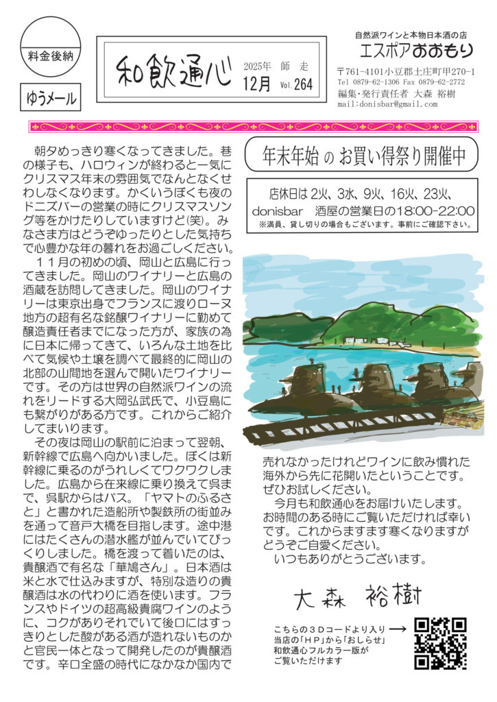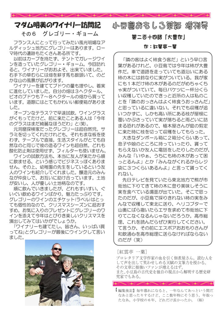 ただ今配布中。遅くなってすみません。冒頭のページは岡山のワイナリーと広島の酒蔵に行った話。途中の呉の港に潜水艦がずらっと並んでいて驚きました。清酒の話は鍋料理とお燗酒。鍋の季節ですね。ワインは、その昔「有坂先生」に直接習ったこと!今では考えられません。ニャンコのは黒子とチャーの毎日。明美のワイナリー訪問記はその6「グレゴリー・ギョーム」」超野生児。好評連載は、小豆島講座が「小豆島と忠臣蔵」まさに12月は忠臣蔵ですね。おもしろ草紙は「大豊作」本当にすごい事になってますね。