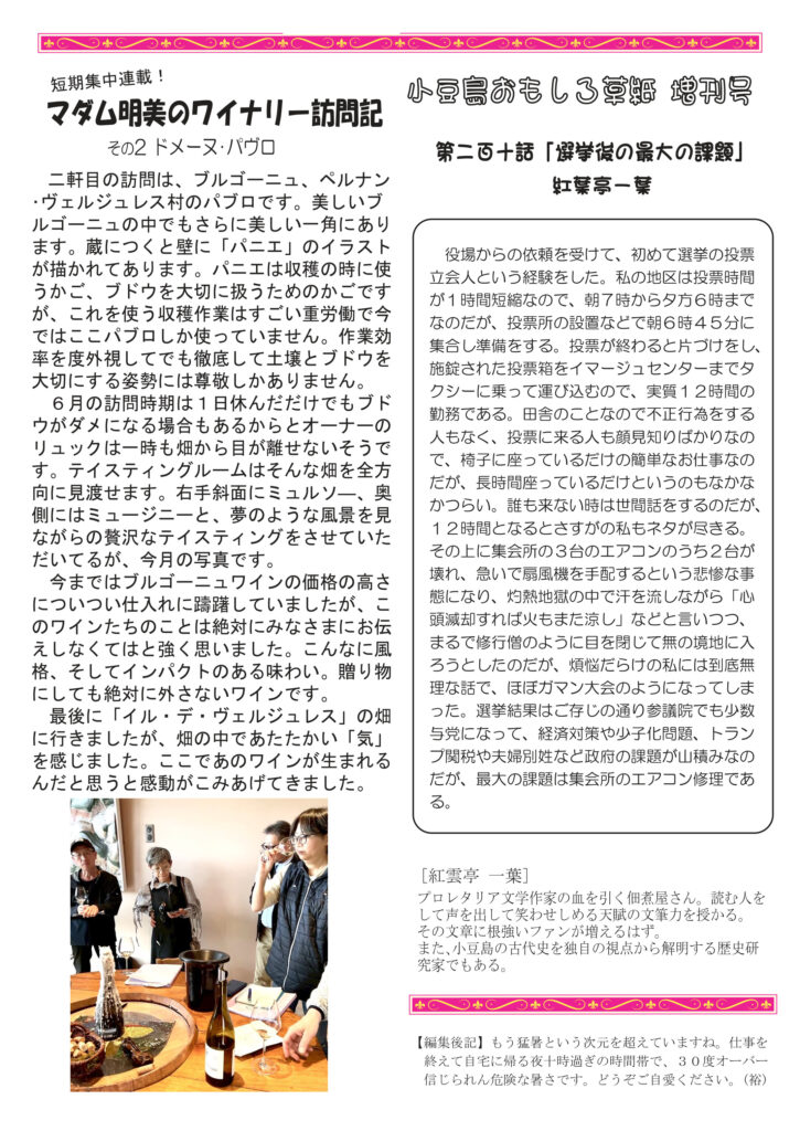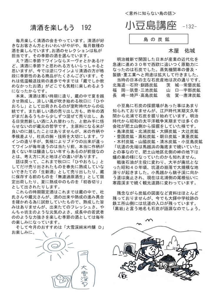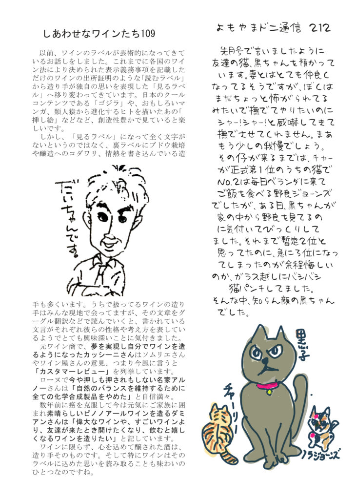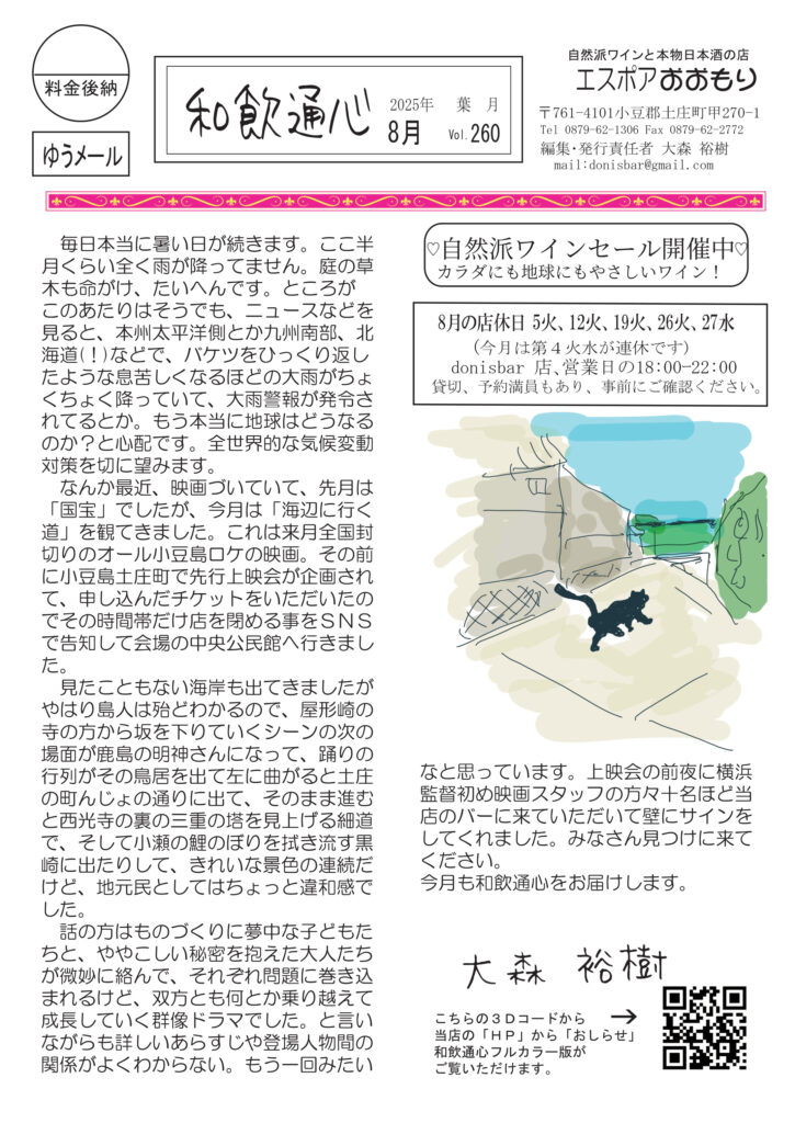 最初のページは映画「海辺に行く道」のこと。横浜監督ドニズバーに来てくれて、壁にサインいただきました。清酒の話は「季節感のある清酒」。ワインはラベルのこと。にゃんこ話は黒ちゃんのこと。マダム明美のワイナリー訪問記は、ドメーヌ・パブロ。ブルゴーニュの神髄ともいえる蔵です。好評連載、小豆島講座は「島の炭鉱」この機に大鐸の炭鉱後を見てみたくなります。おもしろ草紙は「選挙後の最大の課題」これは絶対必読(笑)。