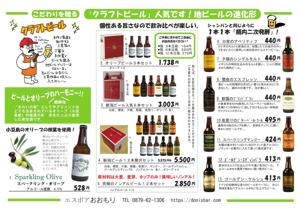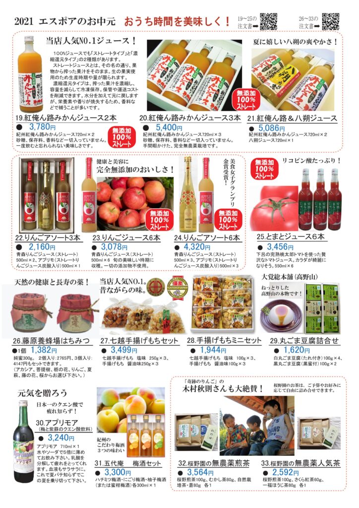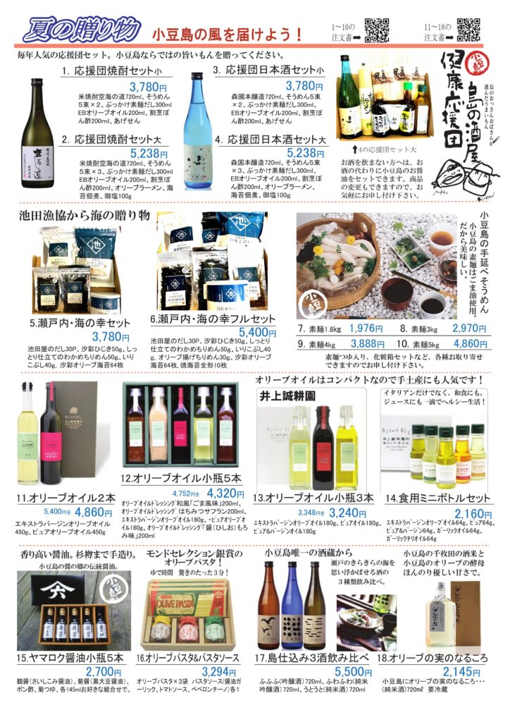今年もエスポアでは、安心、安全で、美味しいもの、喜んで頂けるものをご用意しました。全国へもお届けできます。お気軽にお問い合わせくださいませ。 ごま油を使ったつるつる小豆島のおそうめん。池田漁協のミネラルたっぷり海の幸醤油、オリーブオイル コロナ禍、美味しいノンアルコールにみんな注目!無添加のジュースで健康を贈ろう。 オリーブの葉っぱがたっぷり入ったビール。夏に飲んでほしいおすすめビールです。