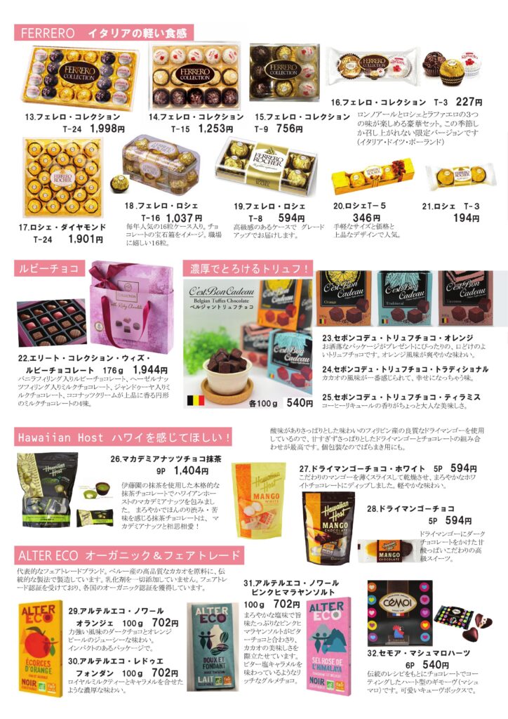 こだわりの輸入チョコレートたち。セボンコデュは会社で配るのにちょうどいい価格でとってもお洒落です。マンゴーチョコはワインと一緒に贈ってほしい。アルテルエコはフェアトレード、オーガニックのチョコレートです。マシュマロハーツチョコは今年は可愛いキューブボックス入り。