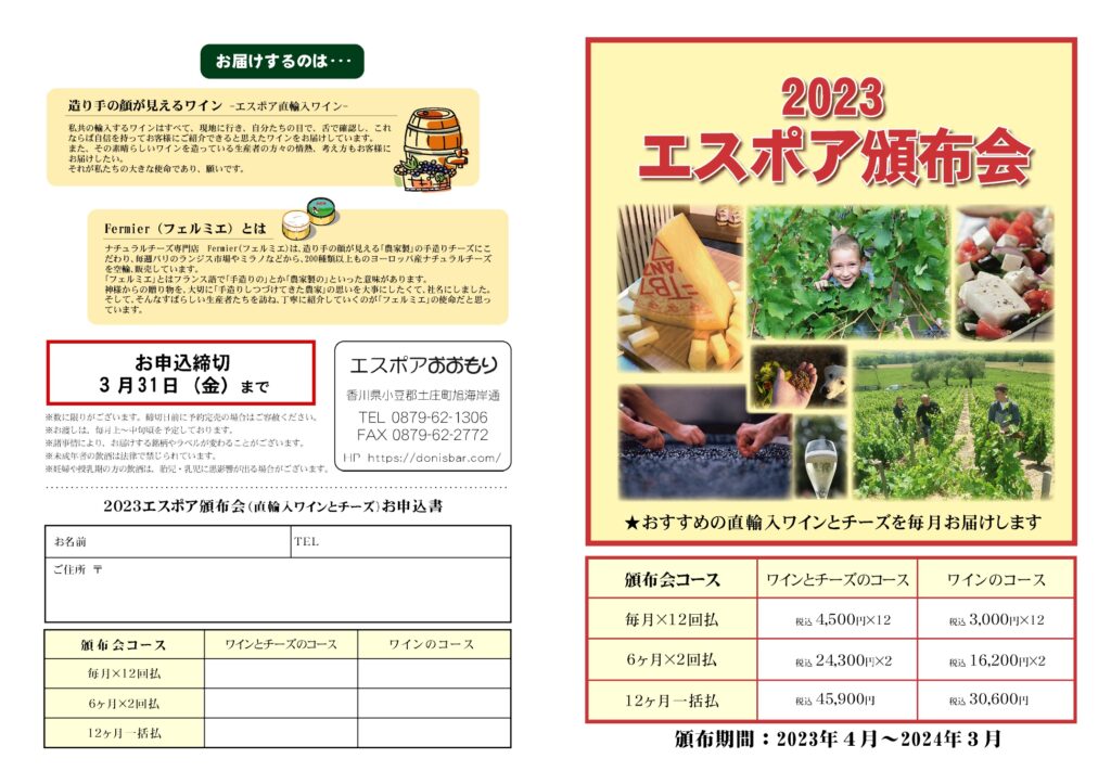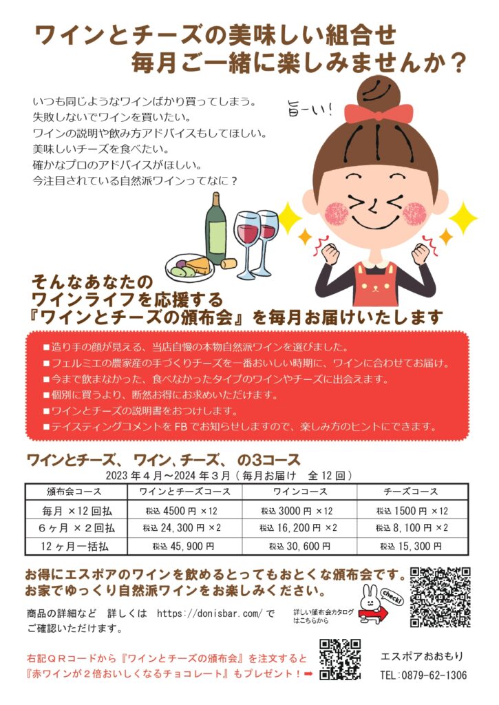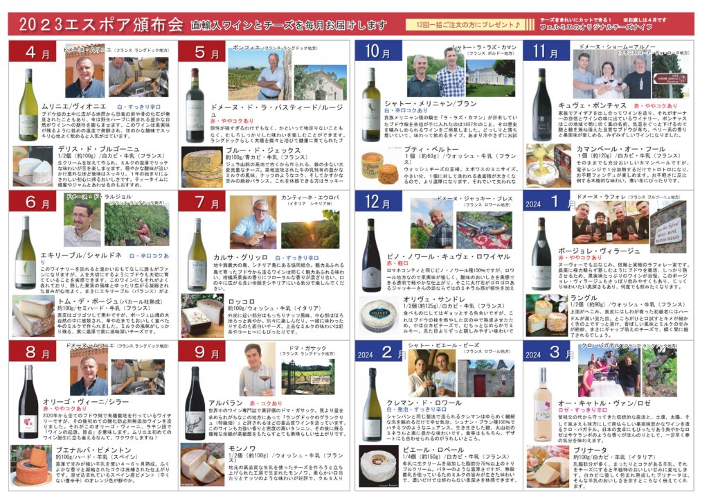 ワインとチーズのマリアージュを楽しめるエスポアの自然派ワインと農家製てづくりチーズの頒布会が春から始まります! とびっきりのペアリングをお家でゆっくりお楽しみください。 2023年4月〜2024年3月(全12回) お得にワインとチーズをお楽しみいただけます。リピーターのお客様がすごく多い頒布会です。また、ワインのみ、チーズのみのコースもございますのでお好みのコースで承ります。