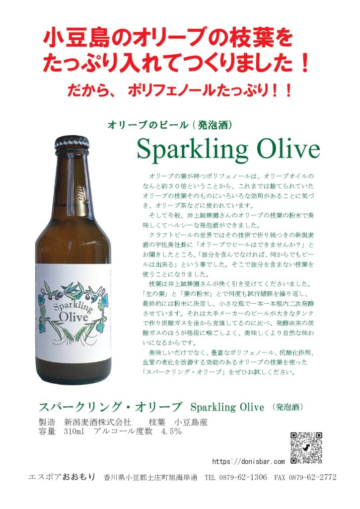 小豆島のオリーブの枝葉をたっぷり使って造ったビール(発泡酒)です。爽やかな味わいです。小豆島の海と山の空気感たっぷりです! 地方発送も承ります。 スパークリング・オリーブはエスポアおおもりはじめ、土庄港の観光センターや、寒霞渓ロープウェイ売店などで販売されています。オリーブ香るビールをぜひお試し下さい。