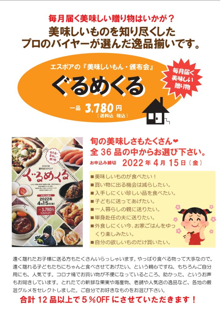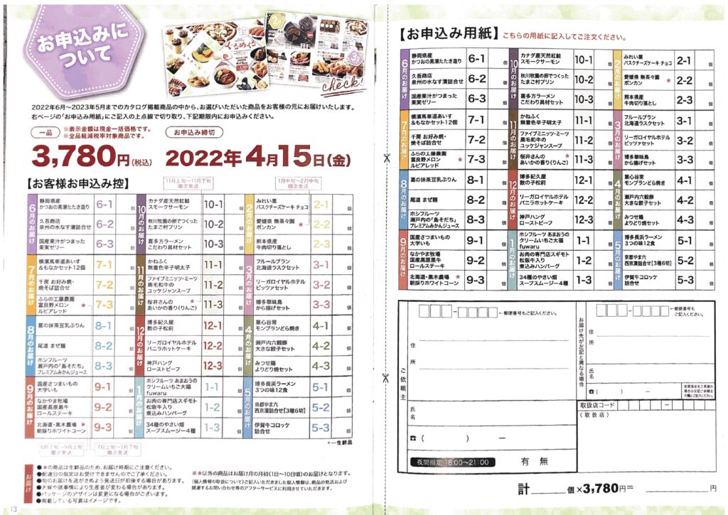 とれたての新鮮な果実や海産物、老舗・人気店の逸品など、各地の厳選グルメの頒布会のご案内です。2022年6月から1年間、全36品の中からお好きなものをお選びください!大事な方への贈り物にも人気です。 7月、8月はお中元にもお使い頂けますよ! どれを選ぼうか、迷っちゃいますね。人が集まる年末年始に大活躍! ケーキも美味しそう。バレンタインにも使えそうですね。