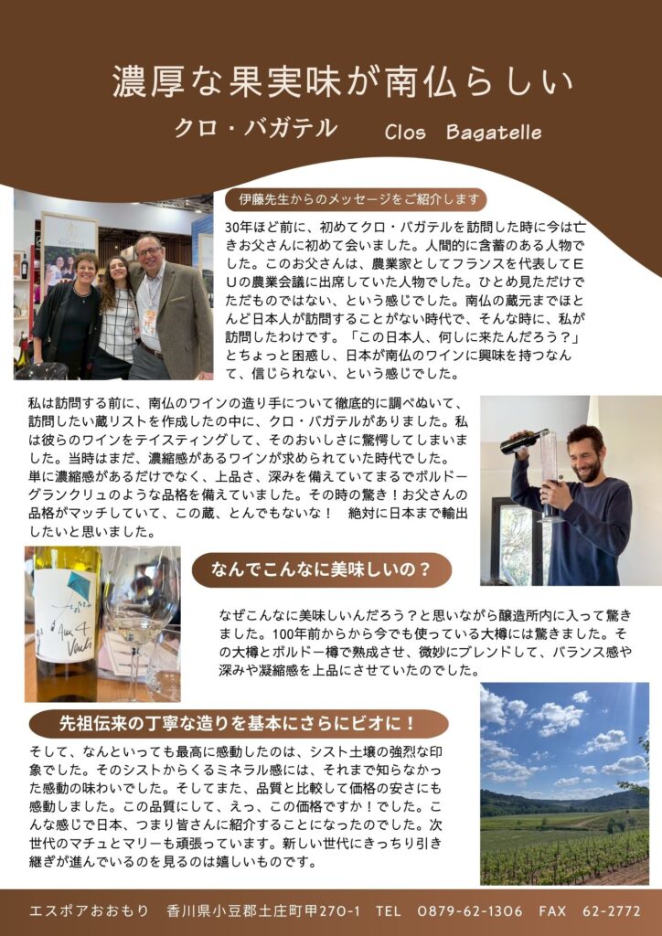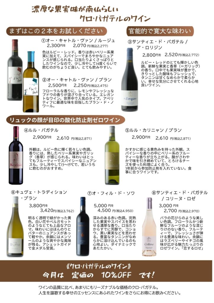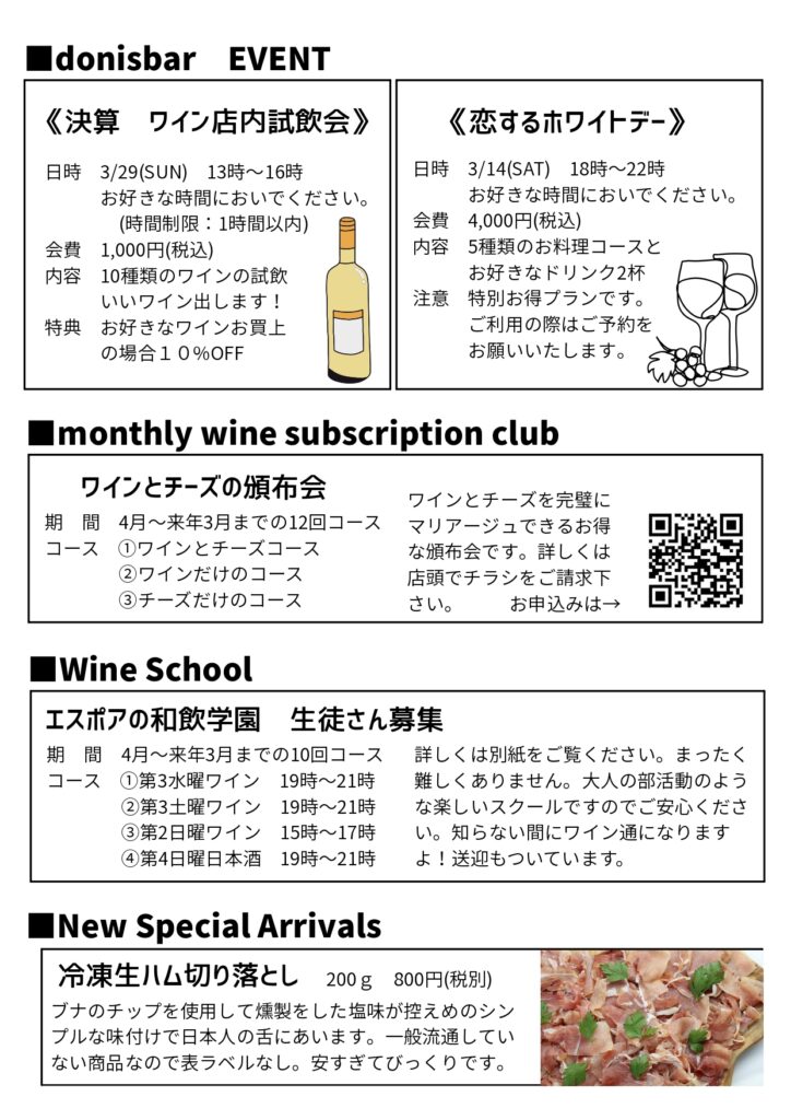 今月のワインはクロ・バガテル。コストパフォーマンスが高く、多彩なワインのラインナップです。3月の旬の日本酒、新鮮なお魚の缶詰、ワイン学園、ワインとチーズの頒布会など、4月から始まる楽しい企画がいっぱいです!店内試飲会もやります!皆様お待ちしています!