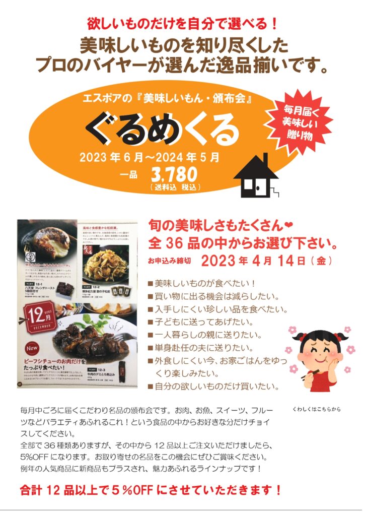 《 2023年6月〜2024年5月 ぐるめくる 美味しいもん頒布会 》 これは!という美味しいものを36品厳選して頒布会にしました。お好きな分をお好きなだけ注文できる自由度100%の楽しい美味しい頒布会です。 この機会に気になっていたあの名品をご賞味ください!