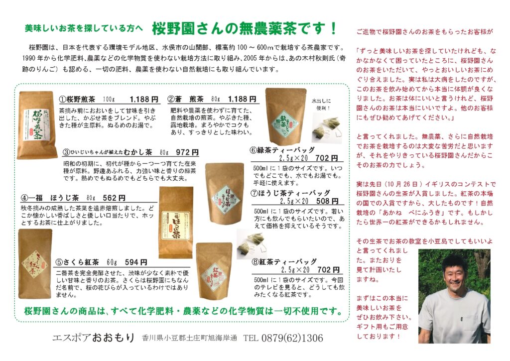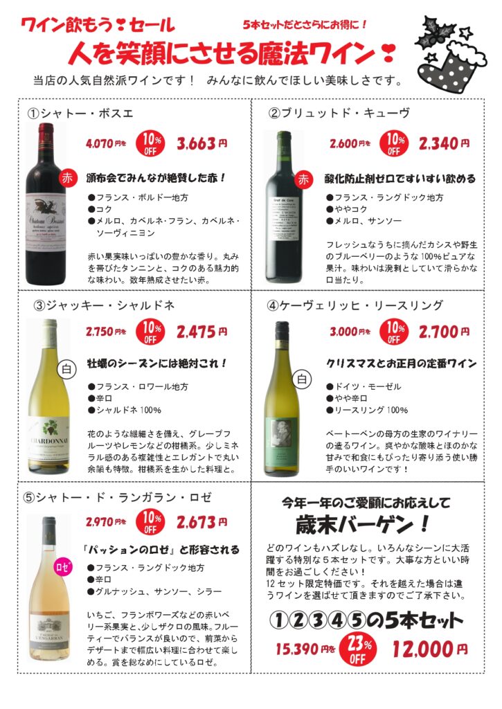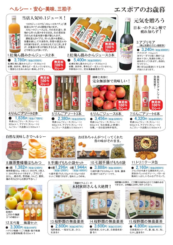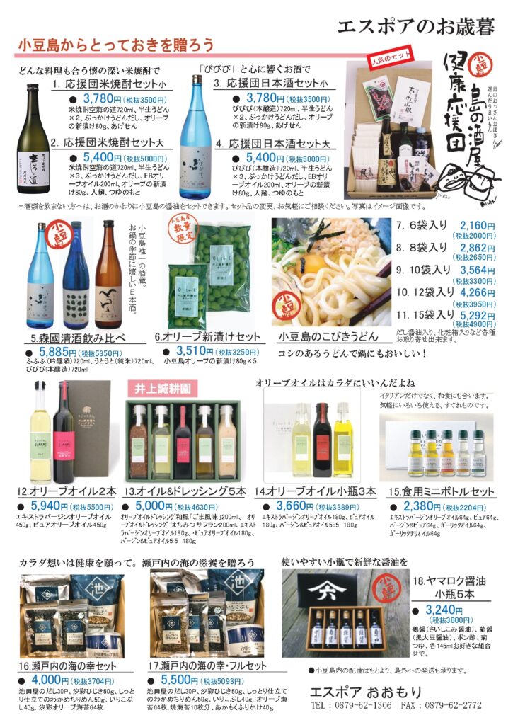 もう今年も最後の月になりました。年末年始におすすめしたいものをいろいろ考えてみました。暮れのご挨拶に最適な商品もたくさんご用意しました。配達も承りますので、お気軽にお申し付けくださいね! 毎年人気の小豆島健康応援団、瀬戸内の海の幸セット、オリーブオイルギフトなど、お歳暮好適品がいっぱいです!島外配送も承ります。 安心してお送りいただけるものを厳選いたしました。暖かい部屋でのストレートジュース、無農薬のお茶など、おうち時間がより楽しくなります。 歳末特別バーゲンです!このワインが無くなった場合は、他のワインに振り替えてお得なセットをお作りいたします。お得に本物自然派ワインをお楽しみください。 家族や友人が集まったら、鍋。日本の冬のあったかい風景。大切な方と食を通じていい時間をお過ごしくださいね。 桜野園さんのお茶がすごいことになっています。飲めばわかるその自然度。美味しいお茶をお探しの皆様、ぜひお試しください。美味しくなかったらお代をお返しします。 去年買ってみて、あまりの美味しさにびっくりした、タムラファームさんのサンふじ。ご家庭用訳ありでも絶対に満足してもらえる自信があります!