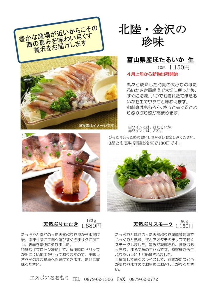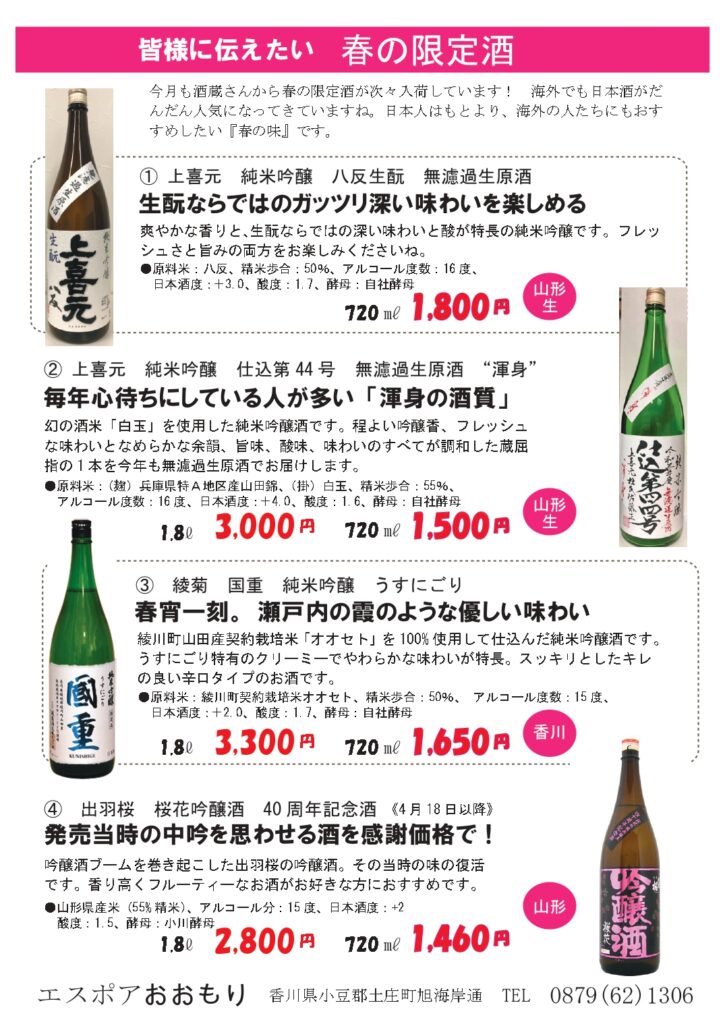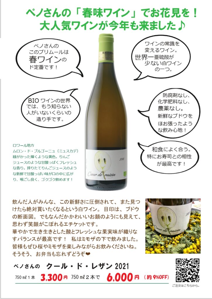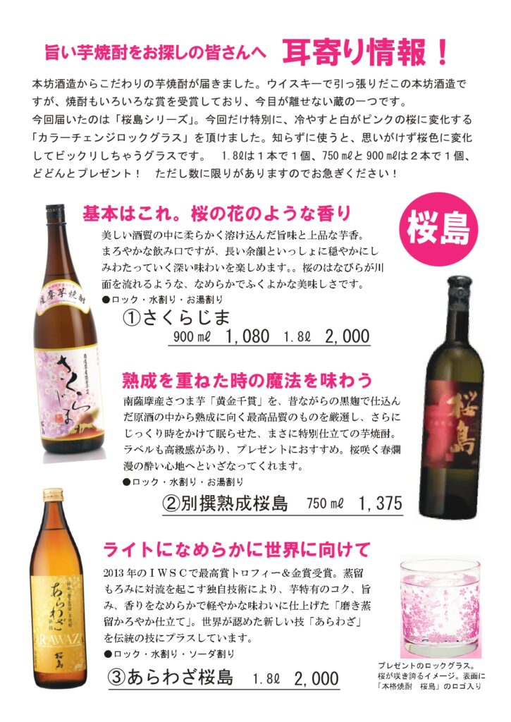 新しい生活が始まる方も多い4月。桜の花でまちがピンクに染まり、そして徐々に新緑の季節へ。生命の力を感じる季節のおすすめをお知らせいたします。 今年のクール・ド・レザンは、ムロン・ド・ブルゴーニュにセミヨンがブレンドされています。去年よりもふくらみを感じる白に仕上がりました。 どれも限定品なのでお早めにどうぞ 冷やすとピンクの桜が現れるロックグラスプレゼントです! 一人暮らしを始める人におすすめしたいヘルシードリンクです。ちょっと疲れたなあ、と思った時に飲んでほしいクエン酸飲料で、疲れ物質の乳酸を溶かしてくれます。 春の珍味、ほたるいか。大きくてつるんと食べれて本当に美味。ぜひご賞味ください。今年の春はなんと、天然ブリの2品が新たに加わりました!