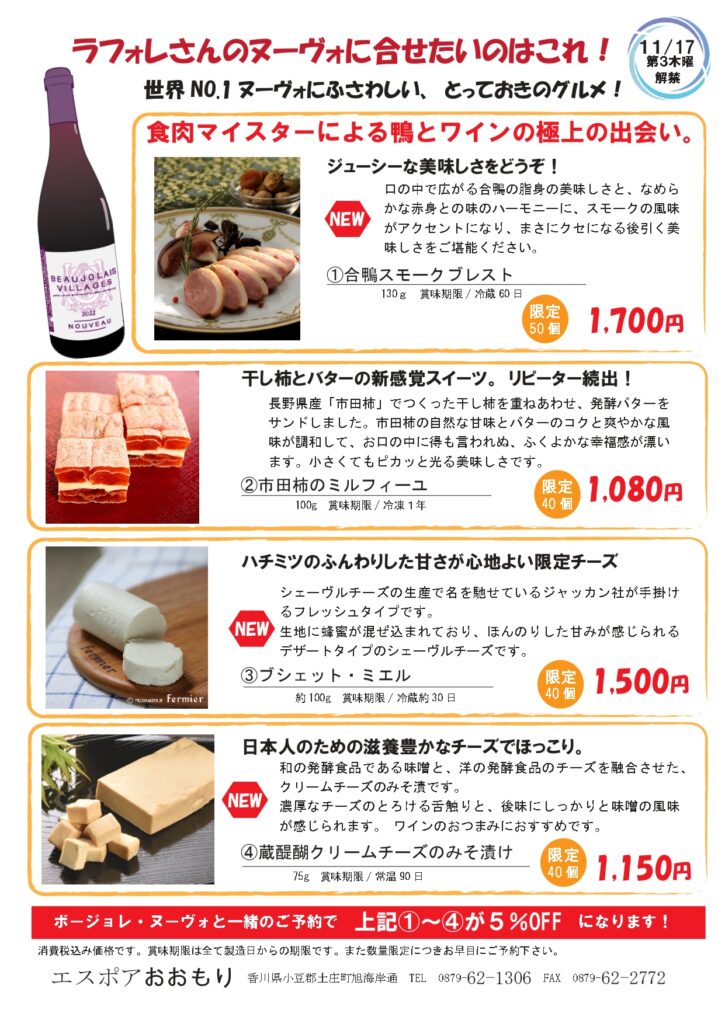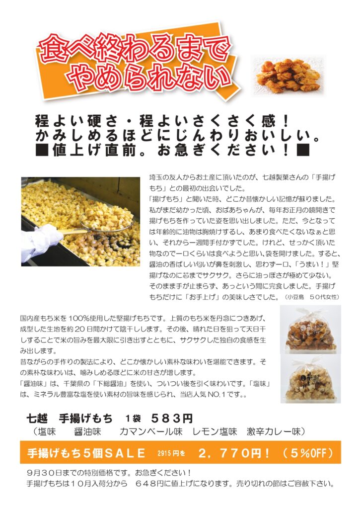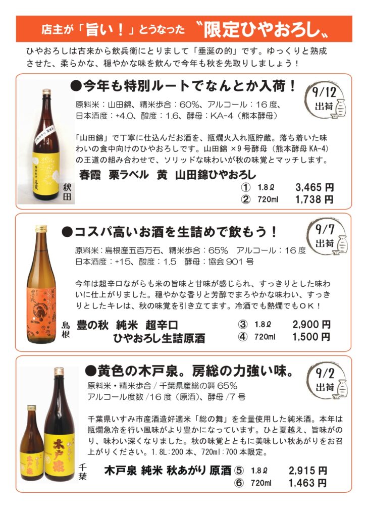 ほのかに秋の気配を感じるようになりました。日本酒の世界ではひやおろしが順次入荷してきますし、ボージョレ・ヌーヴォの予約受付もスタートしました。実りの秋を実感できる商品のご案内です! 今年は、クリュボージョレとの興味深い飲み比べで、ラフォレさんのワインにどっぷりはまってください! ラフォレさんのワインと召し上がると最高です! どれも個性豊かで切れ味の良いひやおろしです! 敬老の日のプレゼントに脳の活性化にもよくて本当に美味しい青魚の缶詰、いいでしょう?もちろんラッピングも承ります! 大人気の七越の手揚げもち。10月から値上げになります。お早目にどうぞ。