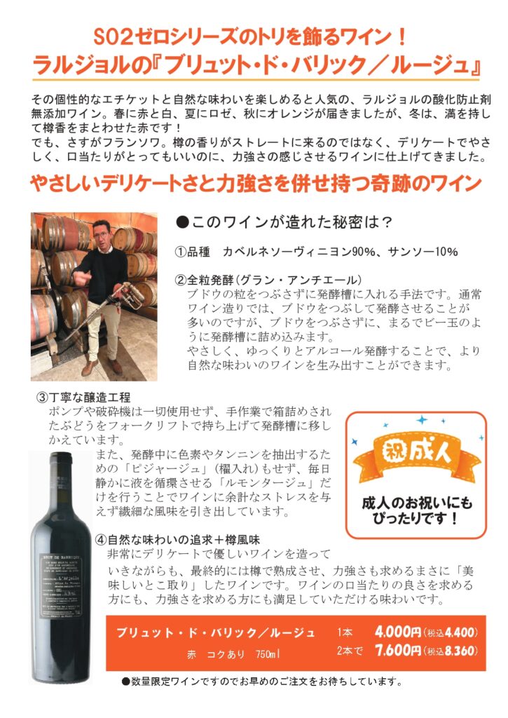 ラルジョルのブリュットシリーズの最終版、樽香をうまく効かせた赤。搾りたて新酒やにごり酒、お燗酒。眠る前に安心して飲んで美味しいノンカフェインコーヒー、コラーゲンのかたまり豚足など、どれもぜひお試しいただきたい逸品です!