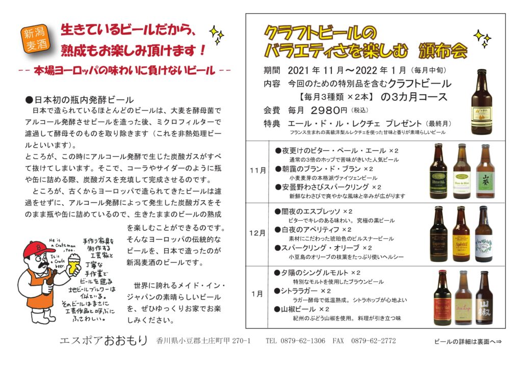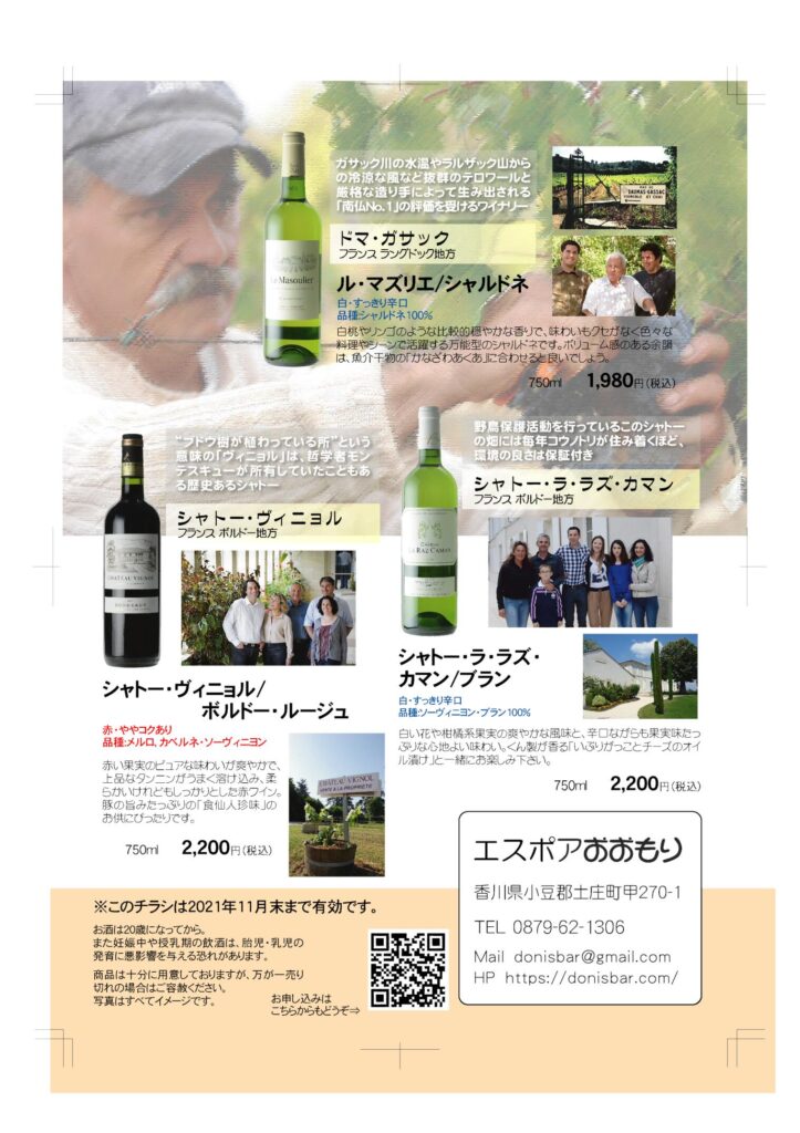 今年も秋祭りの太鼓の音は聞こえませんが、その分夜は長い。美味しいワインやお酒をゆっくり楽しむ『食欲の秋』応援します!! それぞれにおいしい。好きなお酒とお好きなあてで、今宵も『あてな夜』 リーズナブルな自然派スルスルワイン! 10月中にご予約下さい。お得でーす! ヌーヴォのご予約と一緒でお得です! 丹波の黒大豆枝豆は、忘れられない美味しさです。 日本人で良かった。と思えるお茶。 個性豊かなクラフトビールの世界を毎月味わえます。 11月から来年1月までの3カ月コースです。今回しか飲めないビールも入っています!ぜひこの機会にお申し込みくださいね。