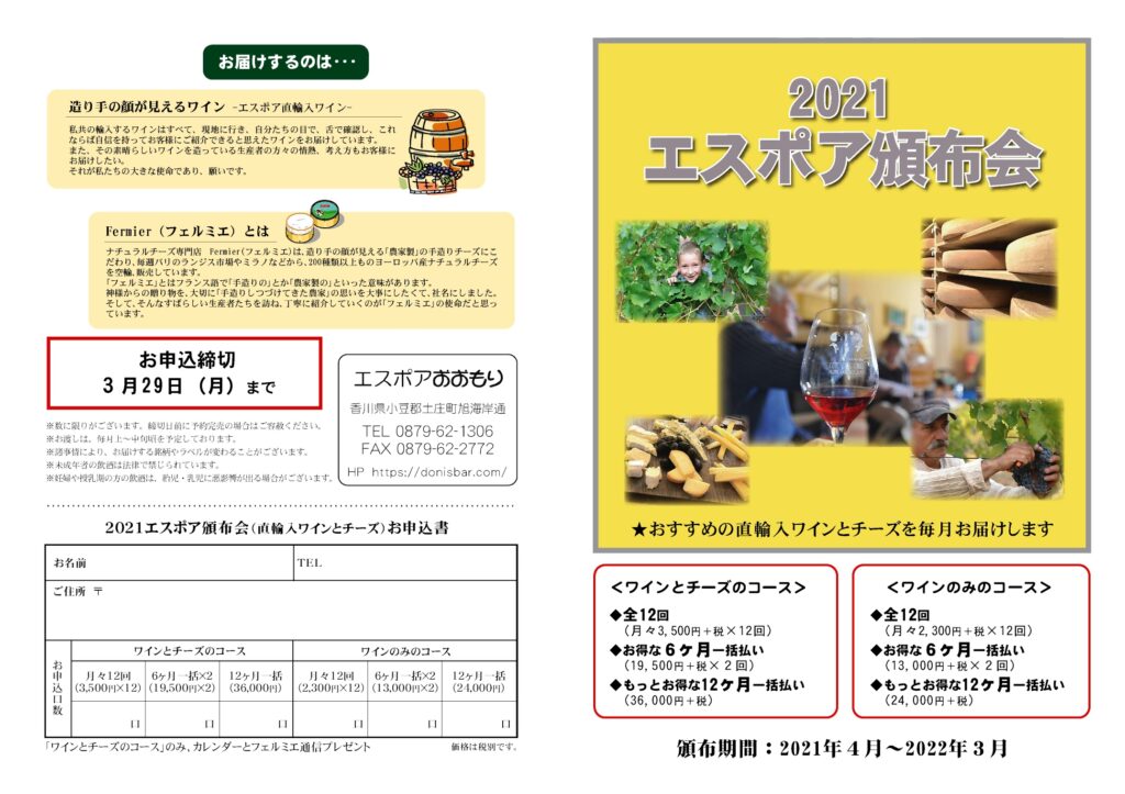 4月から毎月、最先端の自然派ワインと農家製の手作りチーズを楽しめる頒布会が始まります。(1年間 12回)