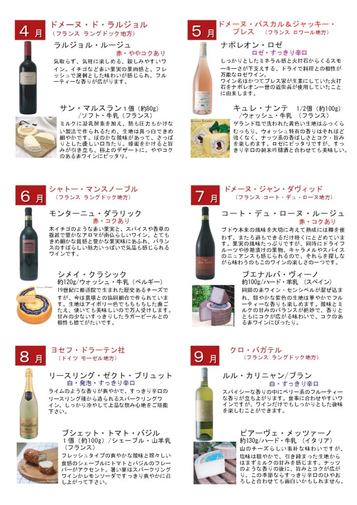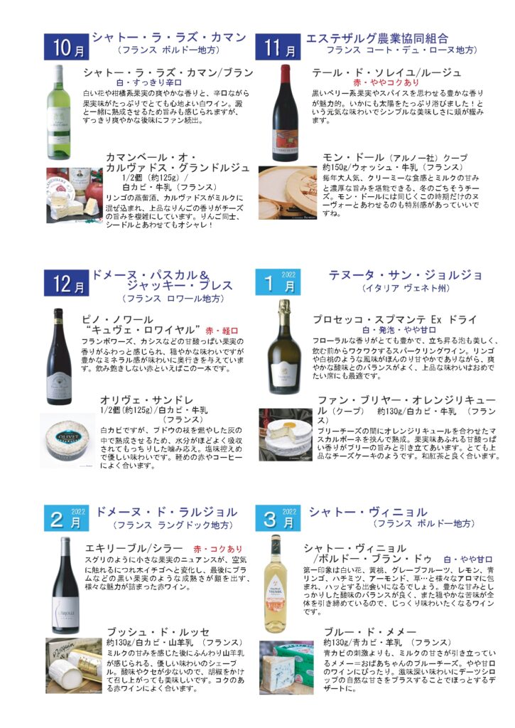 そんな悩みをお持ちのお客様は多いと思いますが、この頒布会ならそんな心配もご無用です。この頒布会を一年飲んで食べてみると、きっとワインとチーズが1年前よりも大好きになっているはずです。
