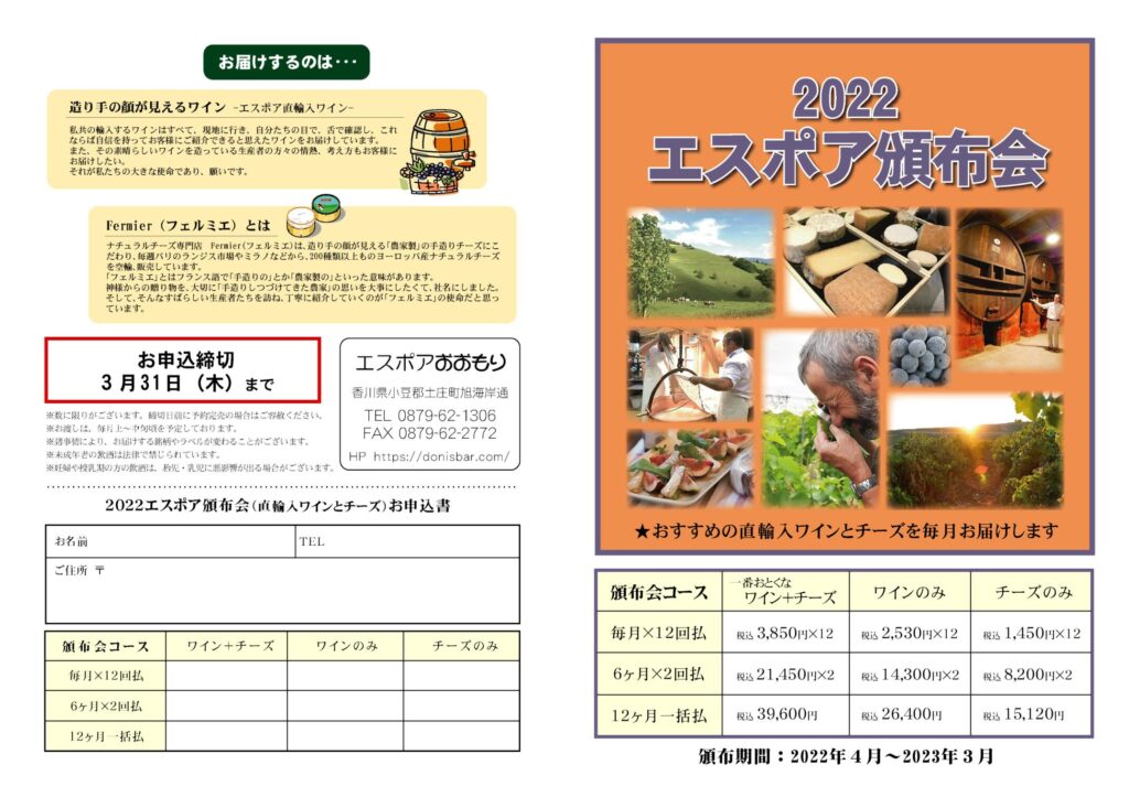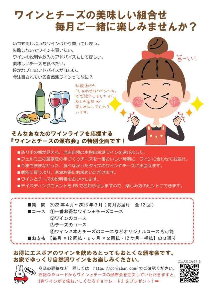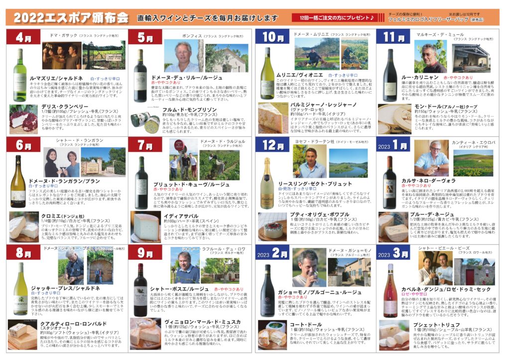 2022年4月~2023年3月まで毎月ワインとチーズを楽しみませんか?あなたのワインライフを応援する企画です。お得にワインとチーズのマリアージュを体験できます。ワインのみ、チーズのみのコースもご用意しました。お家ワイン、気軽にお楽しみください。 テイスティングコメントもお知らせしますので、お家ワイン教室としても楽しんで頂けると思います! コースは3種類、お支払い方法も3種類ご用意しました。 今年も素敵なワインとチーズが勢ぞろいしました!