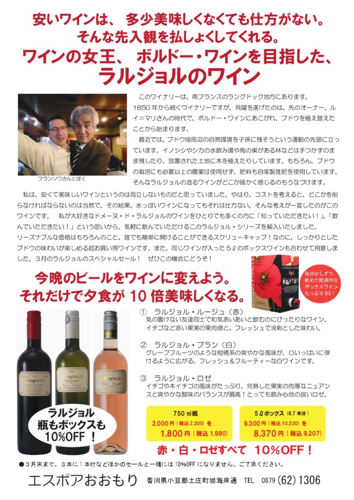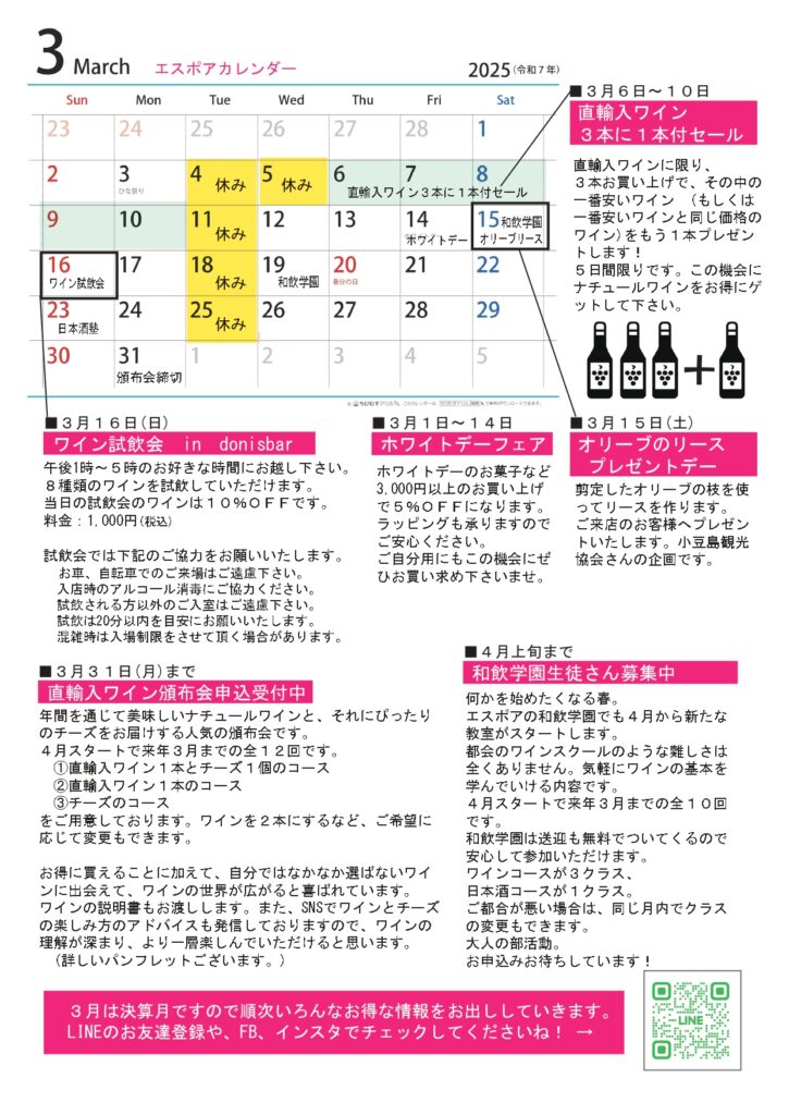 人の動きがある3月。ちょっとしたプレゼントやお祝いなどはおまかせください。ナチュールワインの美味しさを楽しんで頂きたいので、3本に1本付セールもします! 店内試飲会、ホワイトデーセール、無濾過生酒など楽しさいっぱいでお待ちしています!