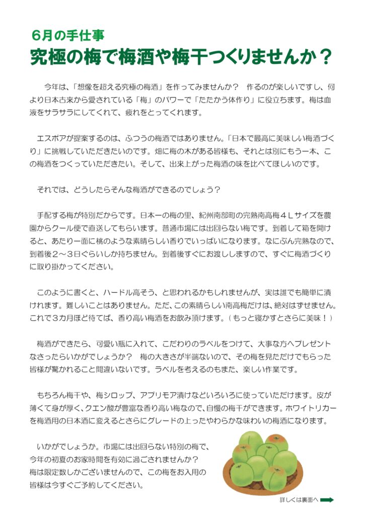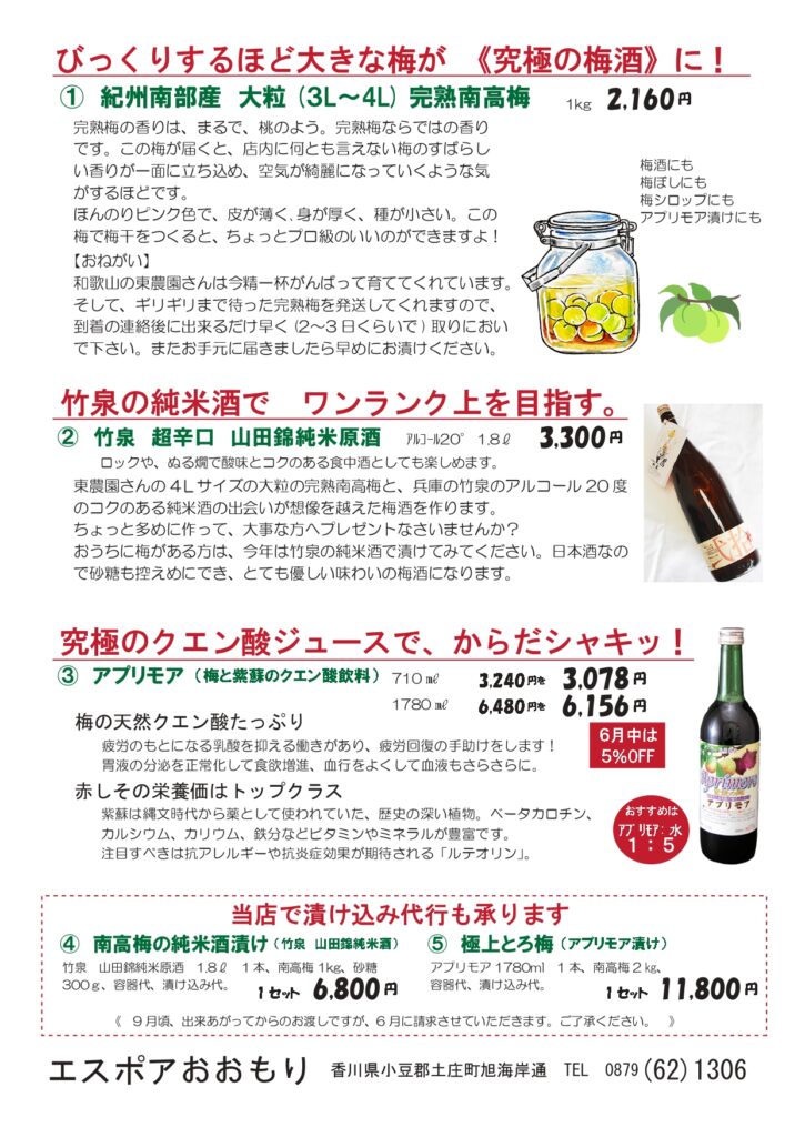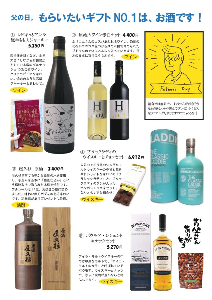 急に暑くなってきましたね。梅雨の季節に気分がぱあっと晴れるペノさんのワイン。今しか飲めない旬の日本酒の数々。6月の手仕事、南高梅のご案内。父の日にお父さんに喜んでもらえそうなセットの提案など。ぜひご来店くださいね。お待ちしています! 今年のミュスカデのラインナップは、長男交替で去年と変わりました。ぜひ今年の3兄弟もお楽しみくださいませ。 先日の日本酒塾でもいくつか飲みましたが、もうおいしくて大人気でした!皆さんにおすすめしたいお酒ばっかりです。父の日のプレゼントにもどうぞ。 毎年楽しみにして下さっているお客様が多い南高梅の4Lサイズ。完熟梅の何とも言えないかぐわしい香りは、スッと嗅ぐだけで命が延びるような感覚になります。この素晴らしい梅で「梅しごと」お楽しみになりませんか? こちらはほんの一例。お父さんの好きなものをセットアップ。「おとうさん、ありがとう!」の気持ちをお届けするお手伝い、させて頂きます!