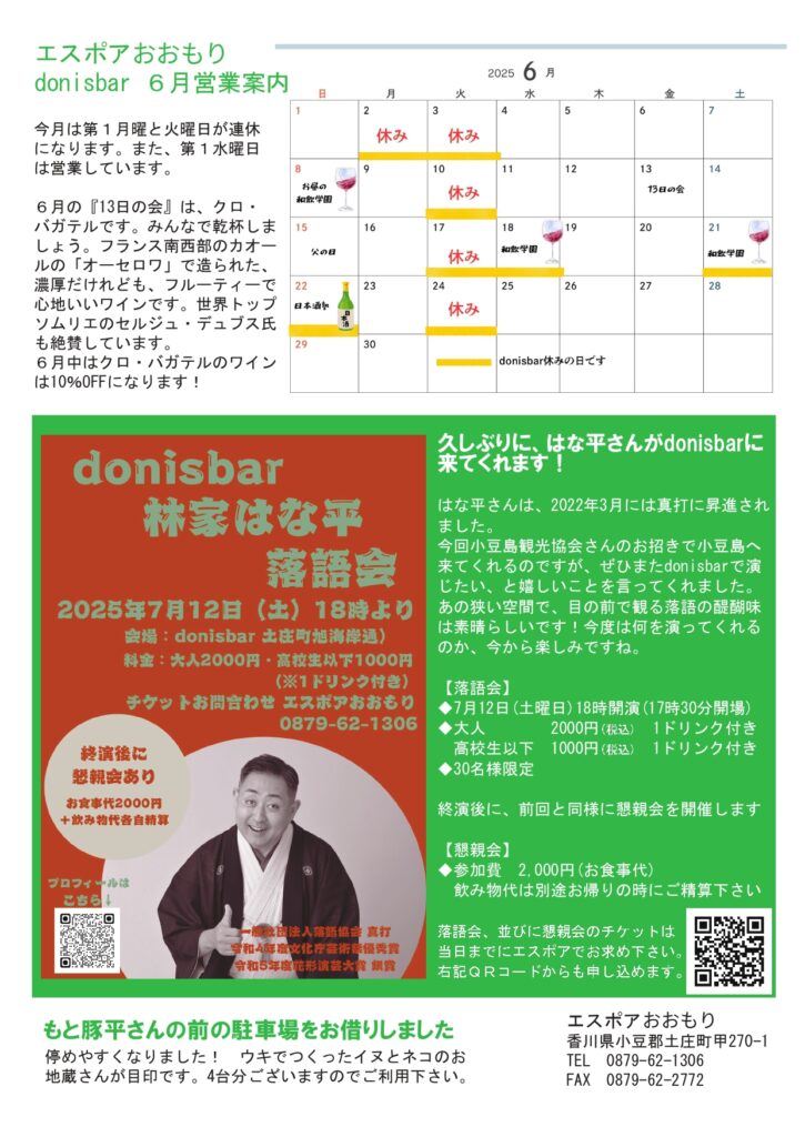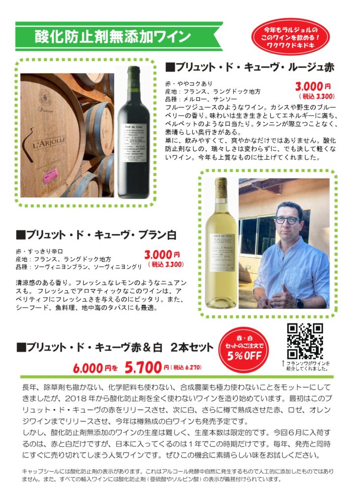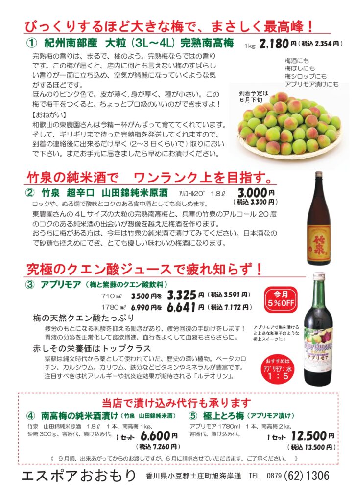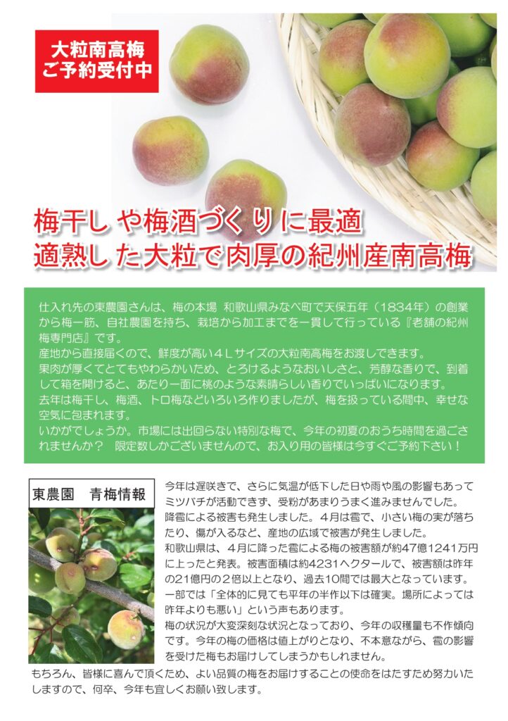 6月のおすすめです。フランスツアーで試飲して、やっぱり今年も美味しいと太鼓判を押せる、ラルジョルの酸化防止剤無添加ワインがいよいよ6月に入荷します。毎年待っていただいている、和歌山の南高梅、初夏の日本酒、クールなグルメなど盛りだくさん。落語会もご参加受付開始です!