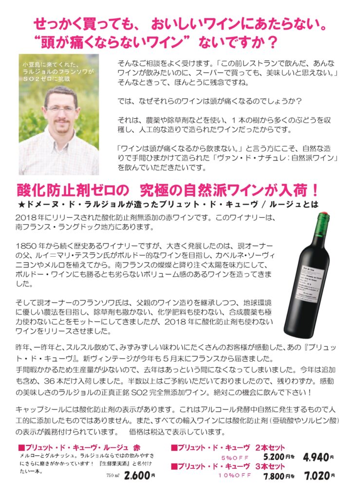 今年の梅雨は長くなりそうですね。そんなジメジメ、じとじとをブッ飛ばす爽やかなワインや、ホッとできるワイン、夏に飲んでほしい日本酒、父の日のおすすめおつまみ、ふつうは市場に出回らない紀州の南高梅など、6月が楽しくなるおすすめ商品をご案内しますね! ラルジョルのSO2無添加の赤。いいお肉の日はこれですよ! 暑くなってきたときに飲んでいただきたい清酒。爽やかな風を感じて。 父の日に、ワイン+おつまみ、日本酒+おつまみで あわせラッピング いたします!